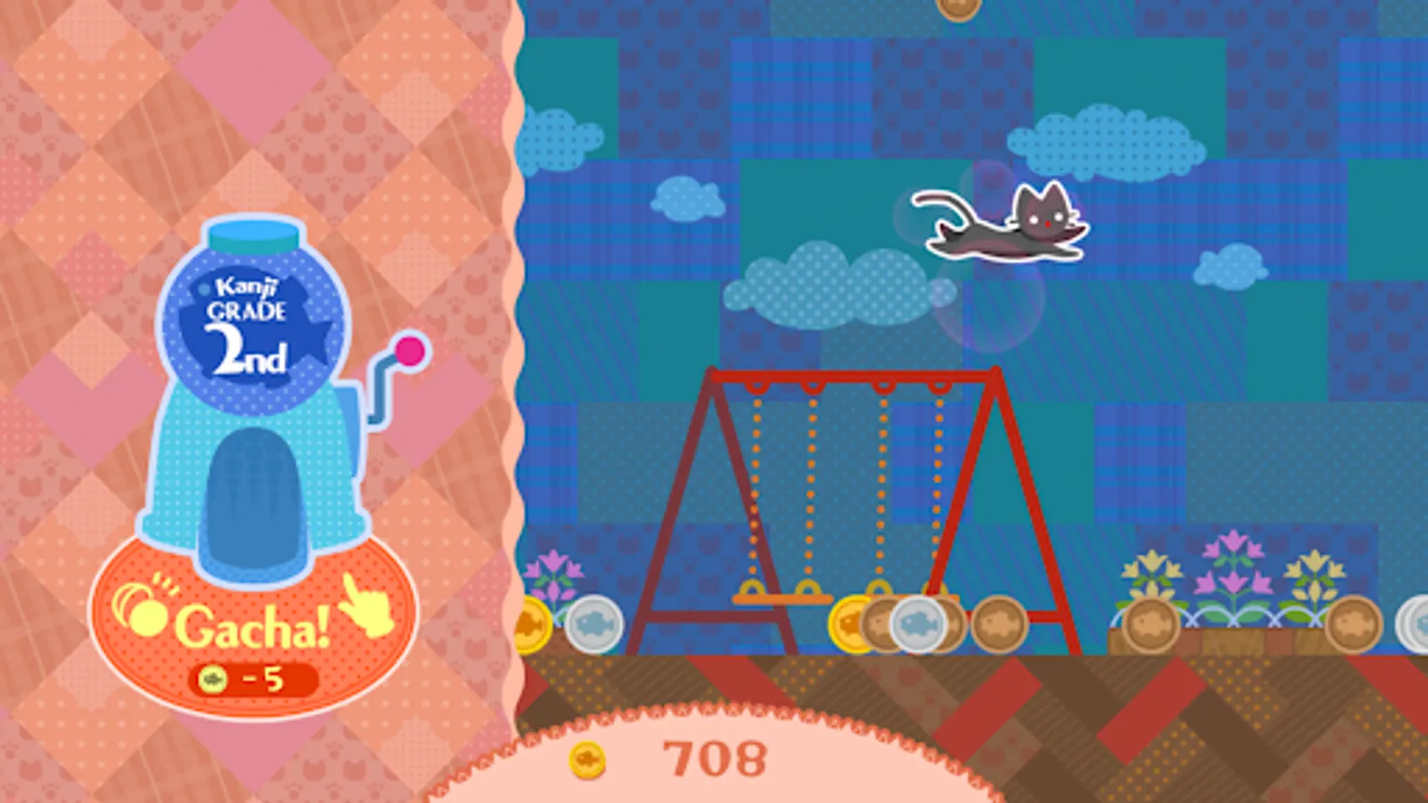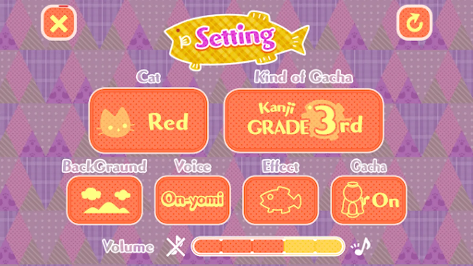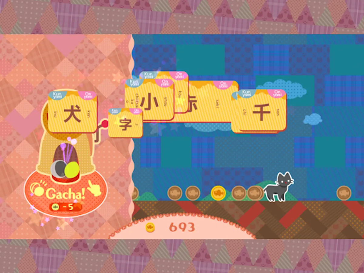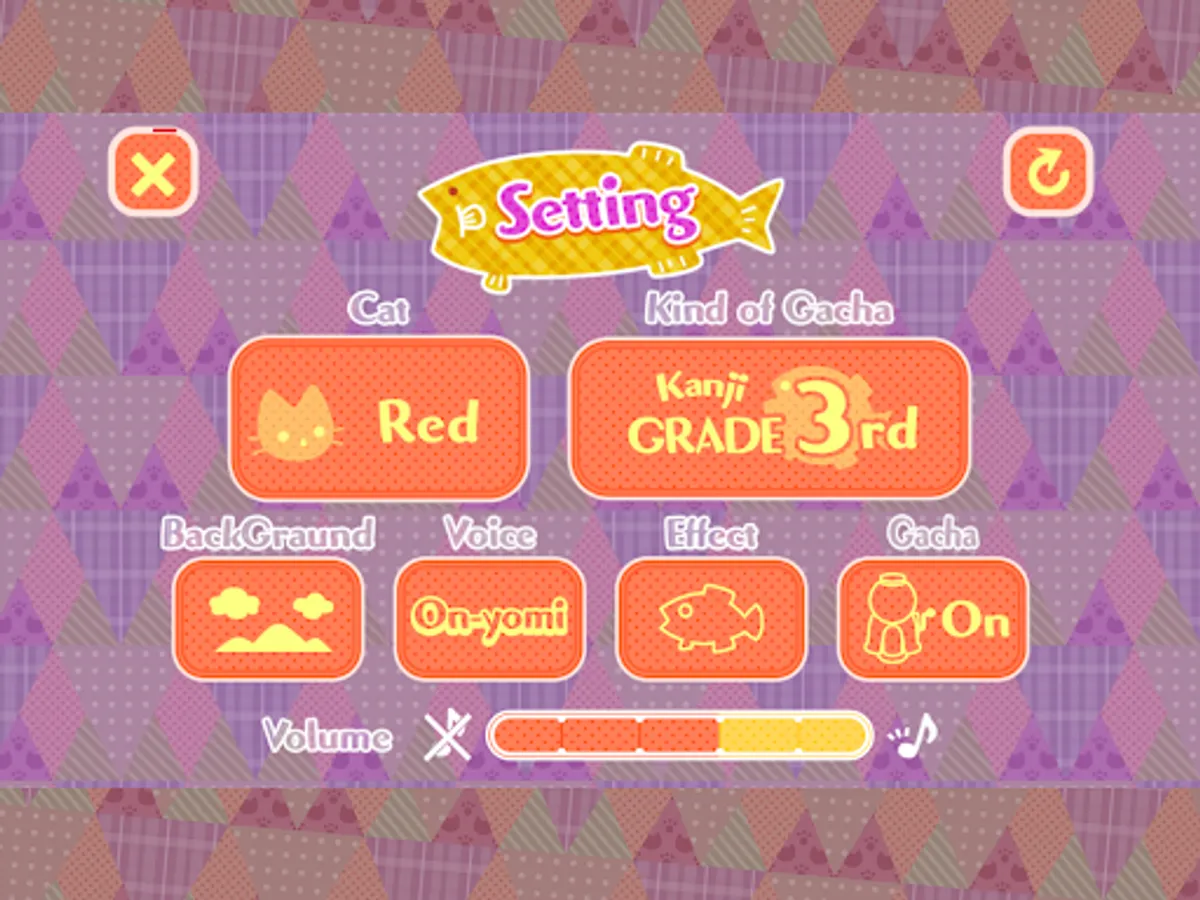 You can change the color of the cat, the grade of the Kanji Gacha, the touch effect, and the pronunciation and kun-yomi of the Kanji characters that appear.