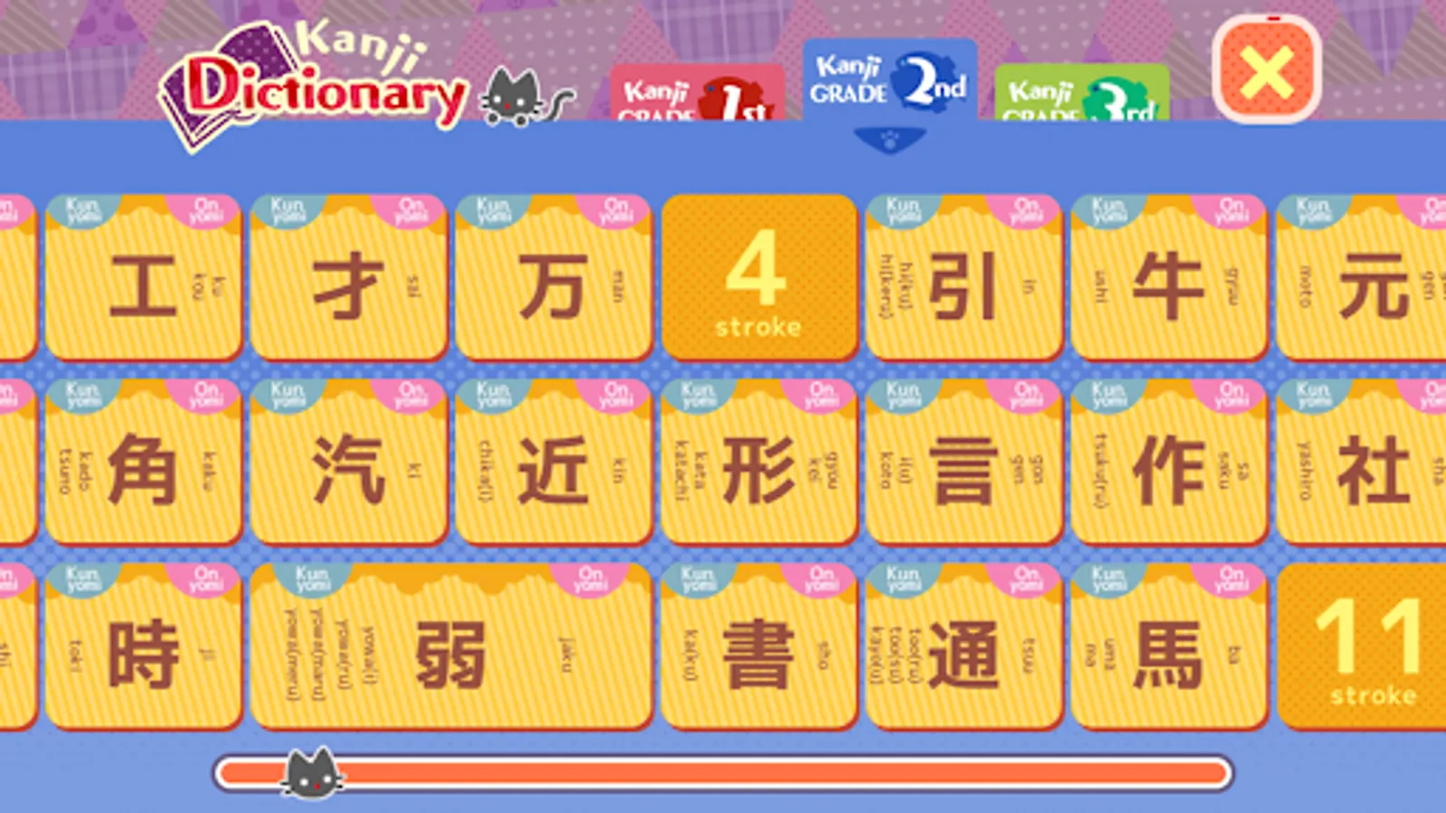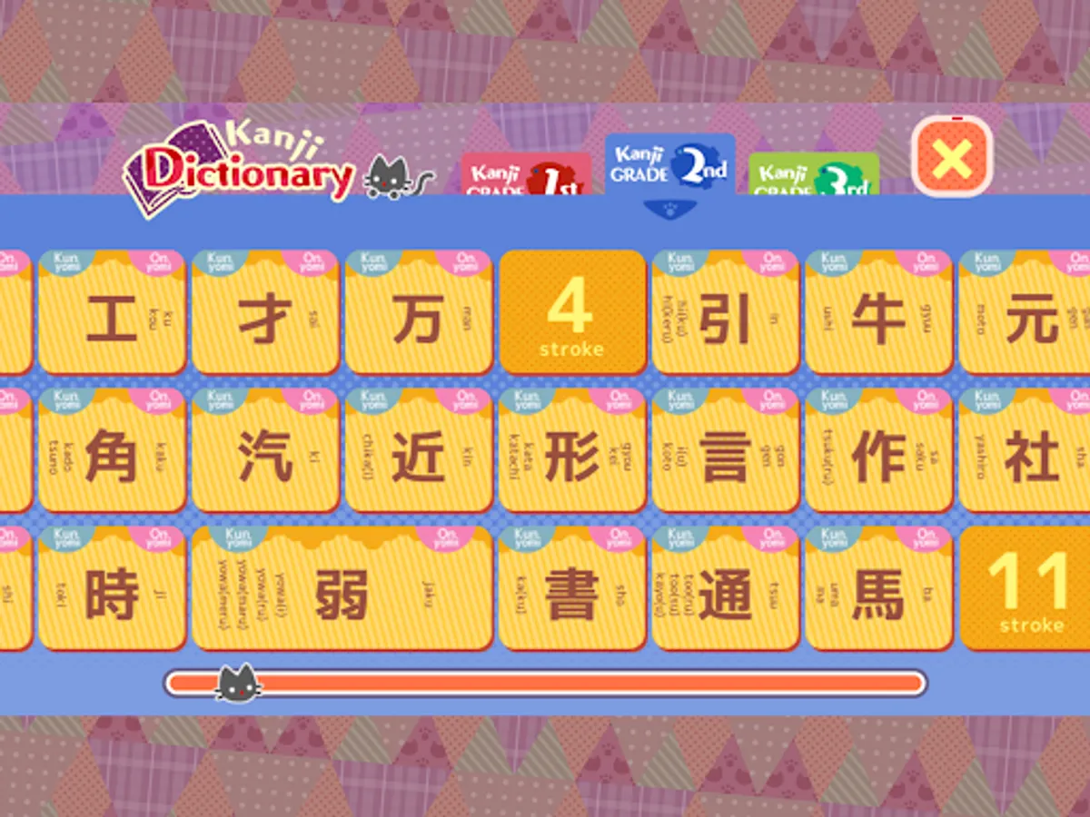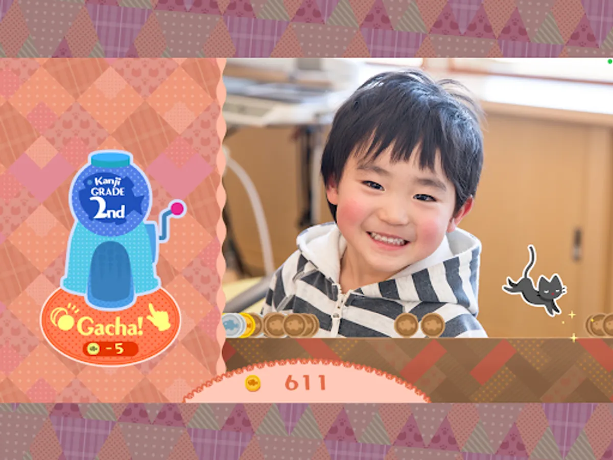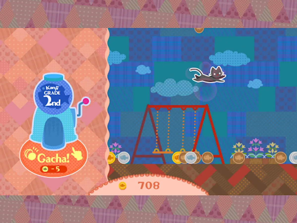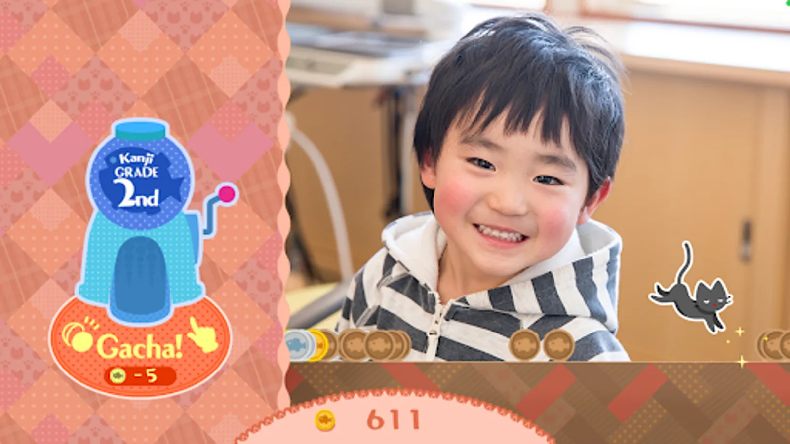 You can change the color of the cat, the grade of the Kanji Gacha, the touch effect, and the pronunciation and kun-yomi of the Kanji characters that appear.