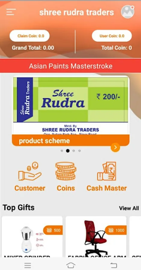 Here, on Dashboard Painter will see his Customers, his coins, gifts, etc. Painter can also see new product scheme which is launched by Shree Rudra Traders.