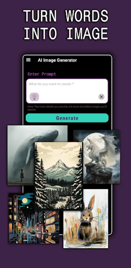 Unleash your creativity and witness the magic of AI image generation with our app. Create, explore, and share your unique visions with the world like never before.