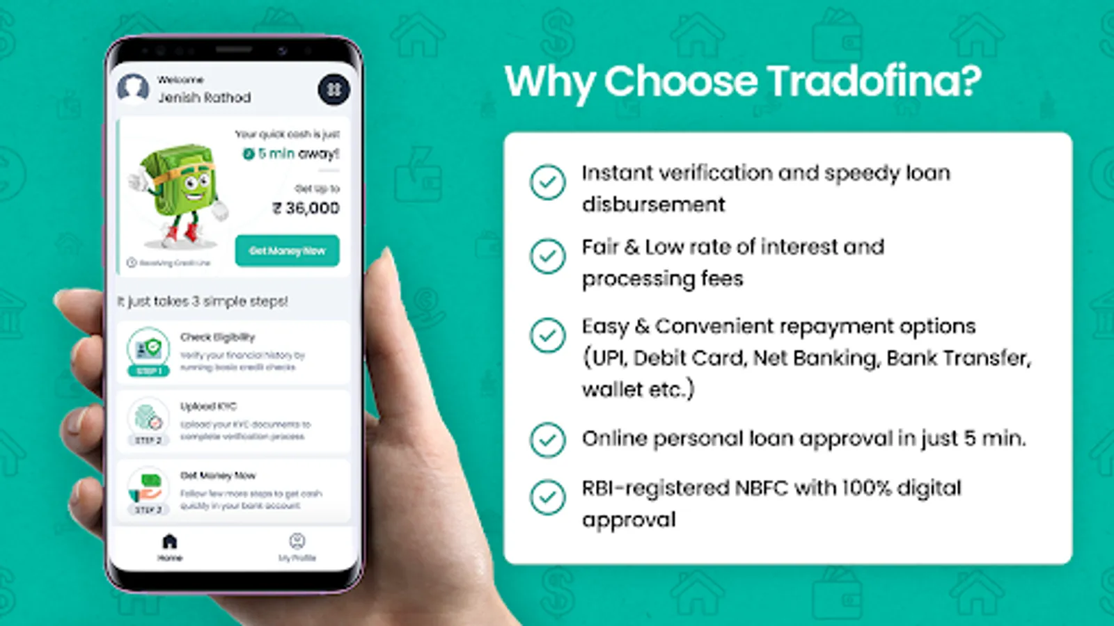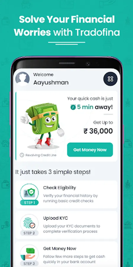 Tradofina, India's fastest digital credit based personal loan app platform. The app provides instant access to credit by RBI-approved NBFC. Tradofina delivers the fastest personal loan experience with 100% paperless, digital KYC process. Once your loan is approved, the amount is credited into your account in just 5 minutes!