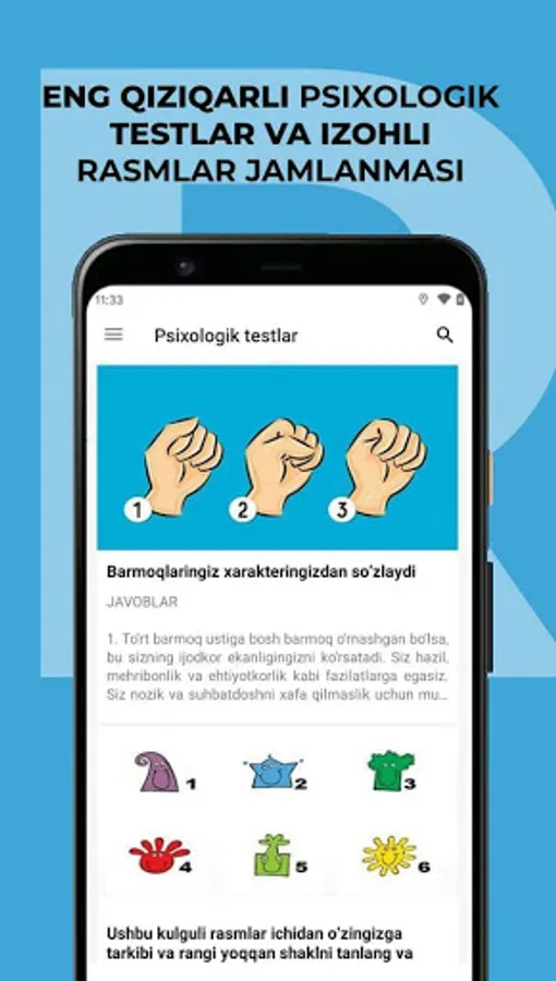 👉 Psixologik testlar - Insonning xarakter xususiyatini ochib beruvchi testlar va qiziqarli rasmlar to'plami.