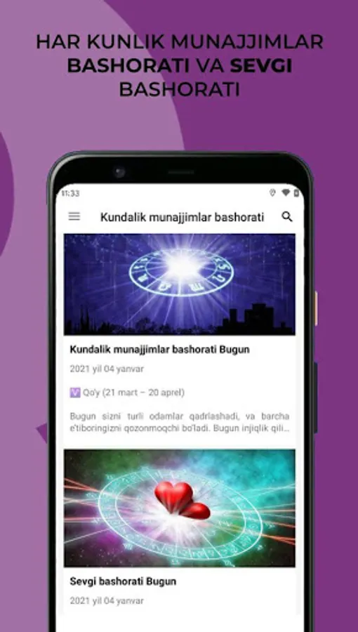 👉 Kundalik munajjimlar bashorati bo'limida siz har kunlik munajjimlar bashorati va sevgi bashoratini kuzatib borishingiz mumkin. Bundan tashqari burjlar va muchallar haqidagi ma'lumotlar ham mavjud.