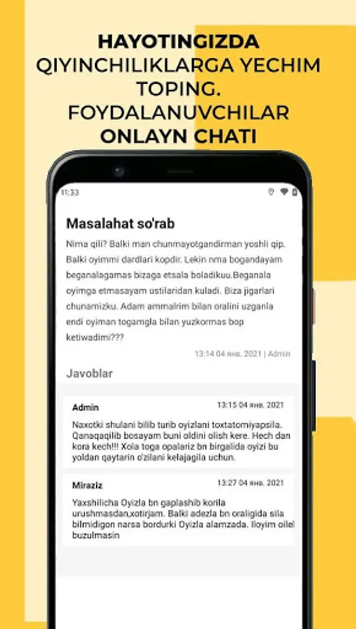 👉 Foydalanuvchilar Chati - dastur foydalanuvchilar uchun maxsus bo'lim bo'lib bunda ular o'zlarini qiynagan ruhiy holatlar haqida anonim tarzda mavzu qoldirishlari va maslahatlar olish imkoniyati mavjud.
