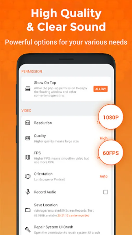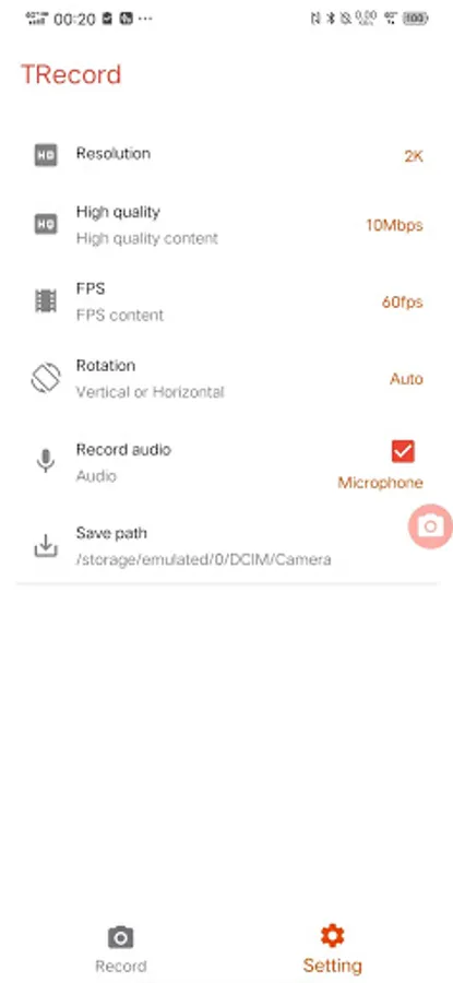 Screen Video Recorder - TRecorder supports recording game screen in the highest quality, 1080p, 12Mbps, 60FPS. Of course, you can record screen with adjustable resolution(240p to 1080p), quality, and FPS(15FPS to 60FPS).