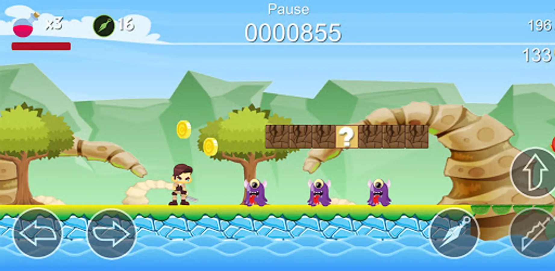 - Break the bricks to get bananas, peaches, and coins