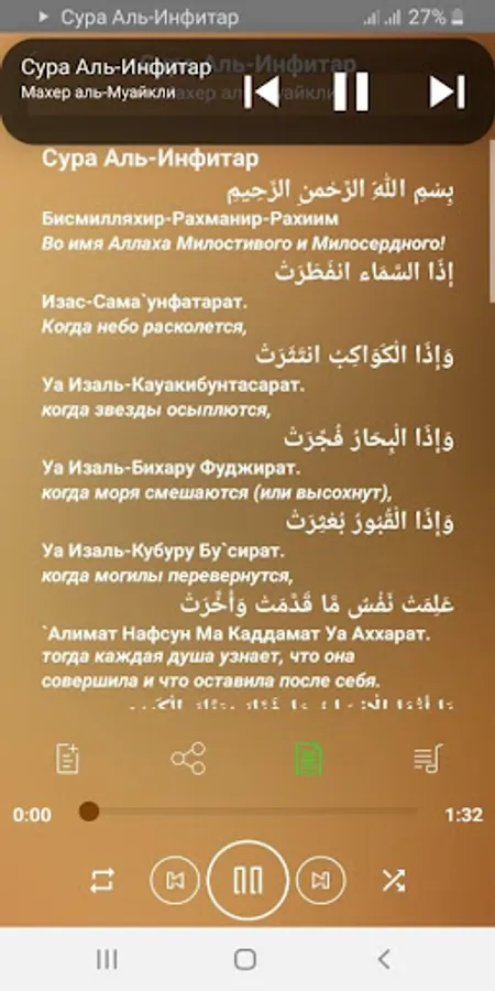 Surah Al-Infitar Audio Mp3 without Internet, text translation into Russian