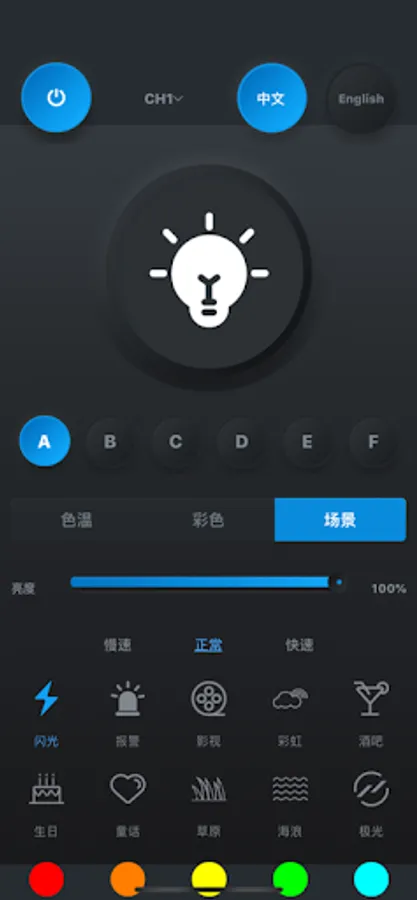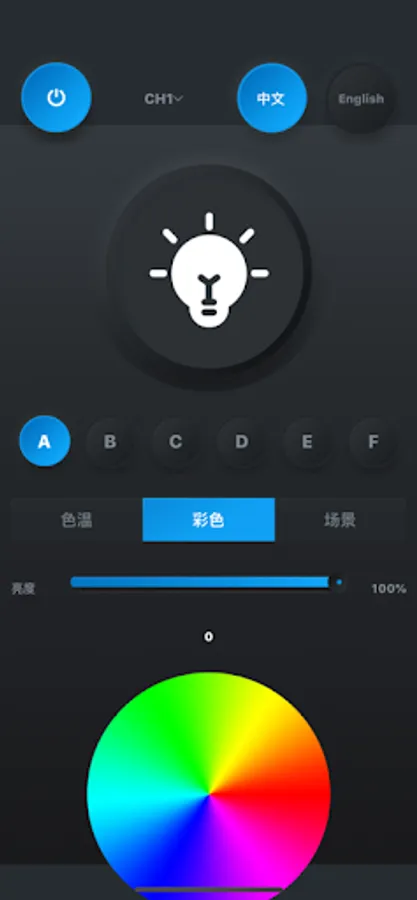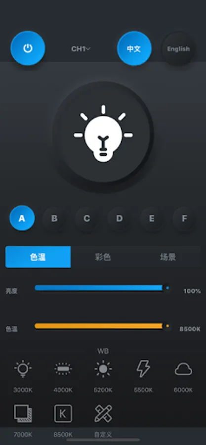 This is an app that can control the bluetooth camera light through the mobile phone's bluetooth broadcast.The mobilephone and the bluetooth light can be controlled without establishing a connection.Before using this APP, you must havea Bluetooth camera light that can receive Bluetooth broadcasts.Select the A, B,C,D,E,F,ALL groups on the APP, and then youcan control the lights of the corresponding group through Bluetooth.The Bluetooth photography lights can work in differentmodes, related to light mode, color mode, yellow and white mode, Scene mode, you can switch between different modes onthe APP. In the color mode, you can touch the color picker at thebottom of the APP to control the color, and the indicator light inthe upper left corner of the APP will also change the colorsynchronously.In each scene mode, you can also adjust thebrightness of the Bluetooth camera light by sliding the brightnessslider. Click the indicator in the upper right corner to switch between the light on and off mode.
