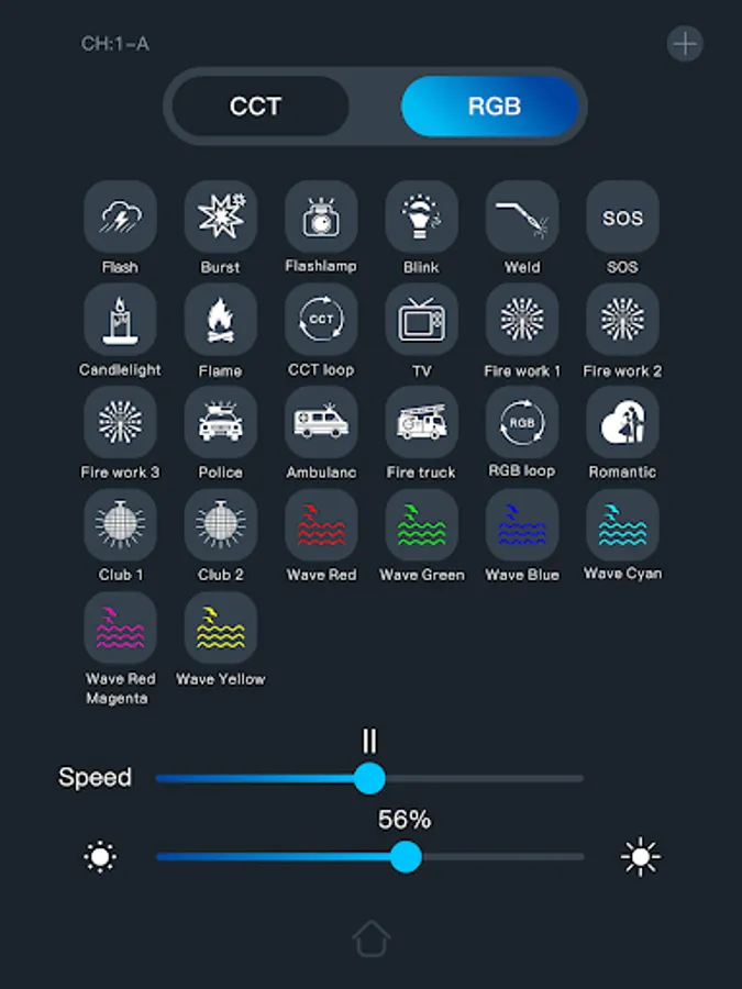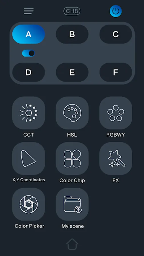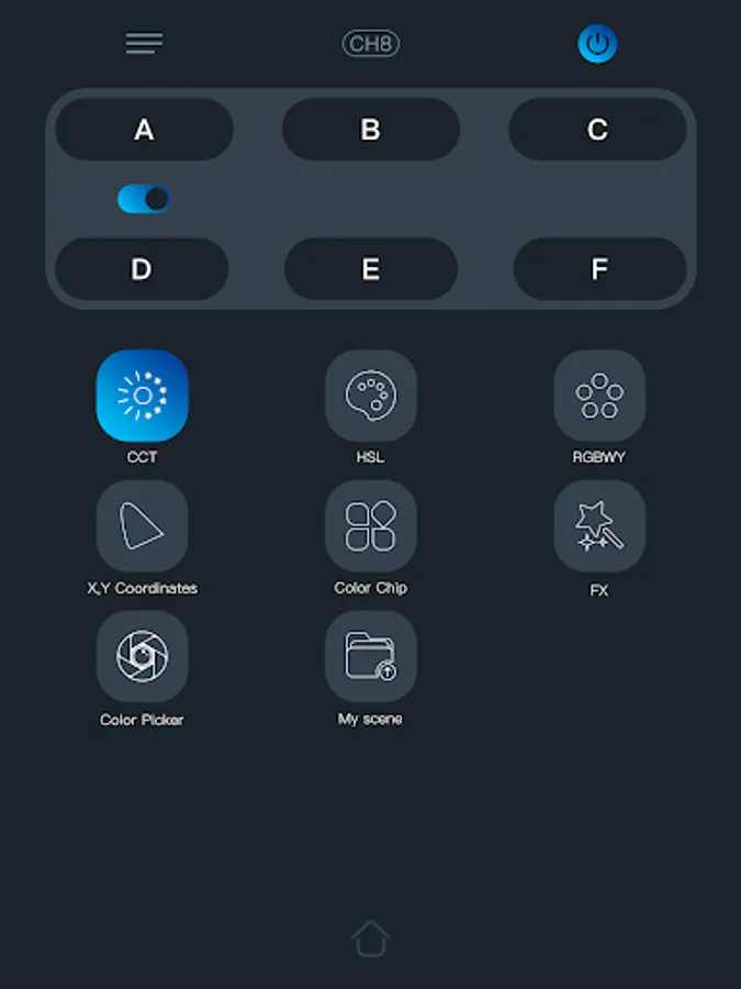 This is an app that can control the bluetooth camera light through the mobile phone's bluetooth broadcast.The mobile phone and the bluetooth light can be controlled without establishing a connection.Before using this APP, you must have a Bluetooth camera light that can receive Bluetooth broadcasts.Select the A, B,C,D,E,F,ALL groups on the APP, and then you can control the lights of the corresponding group through Bluetooth.The Bluetooth photography lights can work in different modes, related to light mode, color mode, yellow and white mode, Scene mode, you can switch between different modes on the APP. In the color mode, you can touch the color picker at the bottom of the APP to control the color, and the indicator light in the upper left corner of the APP will also change the color synchronously.In each scene mode, you can also adjust the brightness of the Bluetooth camera light by sliding the brightness slider. Click the indicator in the upper right corner to switch between the light on and off mode.