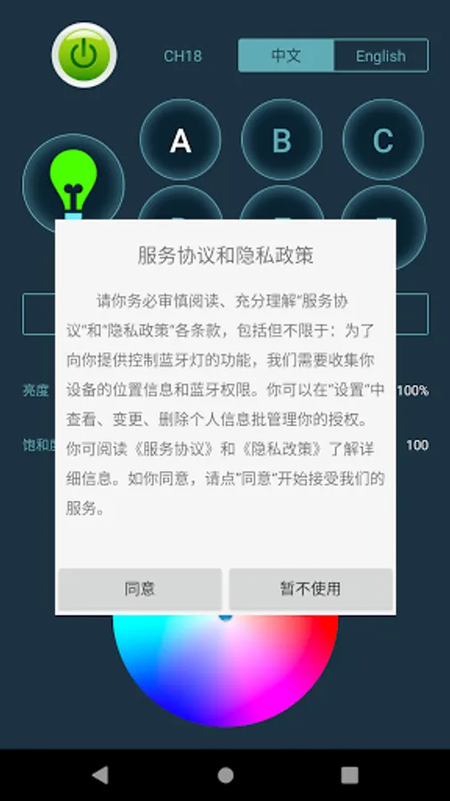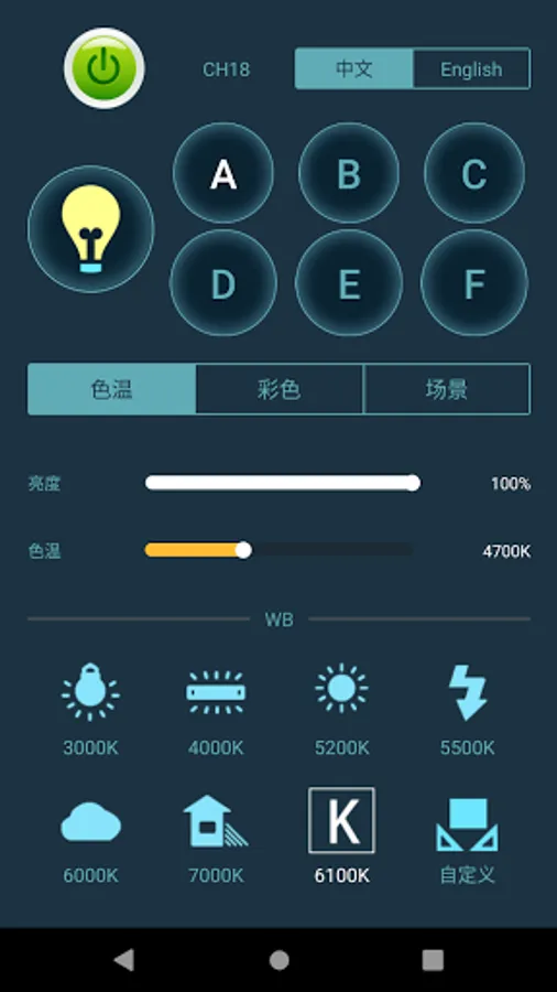 This is an APP that can control the Bluetooth light through the mobile phone’s Bluetooth broadcasts. The mobile phone and the Bluetooth light can be controlled without establishing connection. Before using this APP, you must have a Bluetooth light that can receive Bluetooth broadcasts. Select the A, B, C, D, E, F, ALL groups on the APP, you can control the lights of the corresponding group through Bluetooth. The Bluetooth light can work in different modes, such as light off mode, color mode, yellow and white mode and scene mode. You can switch between different modes on the APP. In the color mode, you can touch the color picker at the bottom of the APP to control the color, and the indicator light in the upper left corner of the APP will also change the color synchronously. In each scene mode, you can also adjust the brightness of the Bluetooth light by sliding the brightness slider. Tap the indicator in the upper right corner to switch between the light-on and light-off modes.