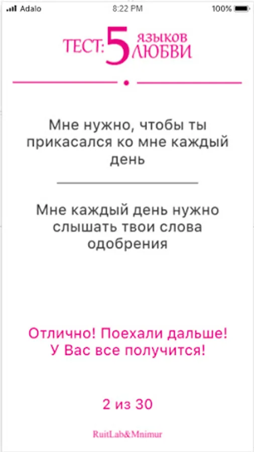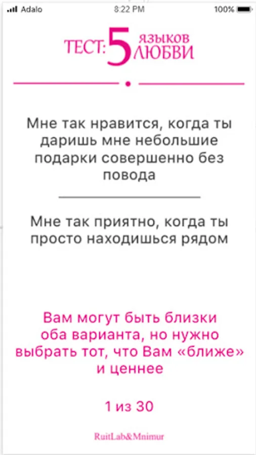 How to express love to your companion? Love can be shown in different ways. Dr. Gary Chapman states that there are five love languages: Words of encouragement; Time; Presents; Help; Touches. Our test will help you understand your love language and share this knowledge with your partner.