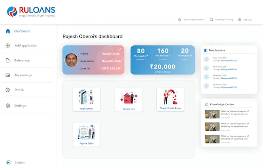 RUCONNECT App is a Fintech platform presented by Ruloans Distribution services Pvt. Ltd. For their channel partners and DSAs. It is a one stop solution for all Financial Products be it Credit Cards, Personal Loans, Business Loans, Home Loans, Loan against property etc. Anyone who wants to become a Loan agent/DSA can onboard and start earning with Ruconnect.