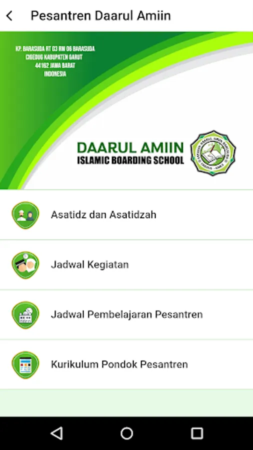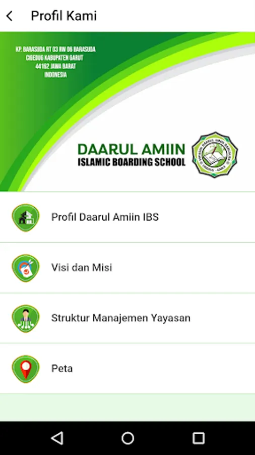 Daarul Amiin Islamic Boarding School as one of the pioneers of educational institutions under the auspices of the Daarul Amiin Barusuda Foundation as an education provider having its address at Kp.barusuda RT 03 RW 06 Barusuda Village, Cigedug District, Kab. Garut Prov. West Java strives and seeks to integrate general education and religious education in the form of boarding schools (boarding schools), so that all students while in the Daarul Amiin Islamic Bioarding School for 24 hours are educated, fostered, and guided to carry out various useful activities for himself and others, his potential is explored and developed, his intellectual traditions are built so that they become generations of Ulul Albab who have moral values and moral values with the application of a balance between Intelligence Quotient (IQ), Emotional Quotient (EQ) and Spiritual Quotient (SQ).