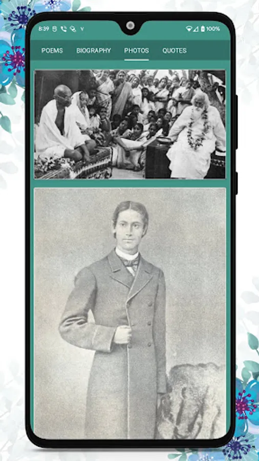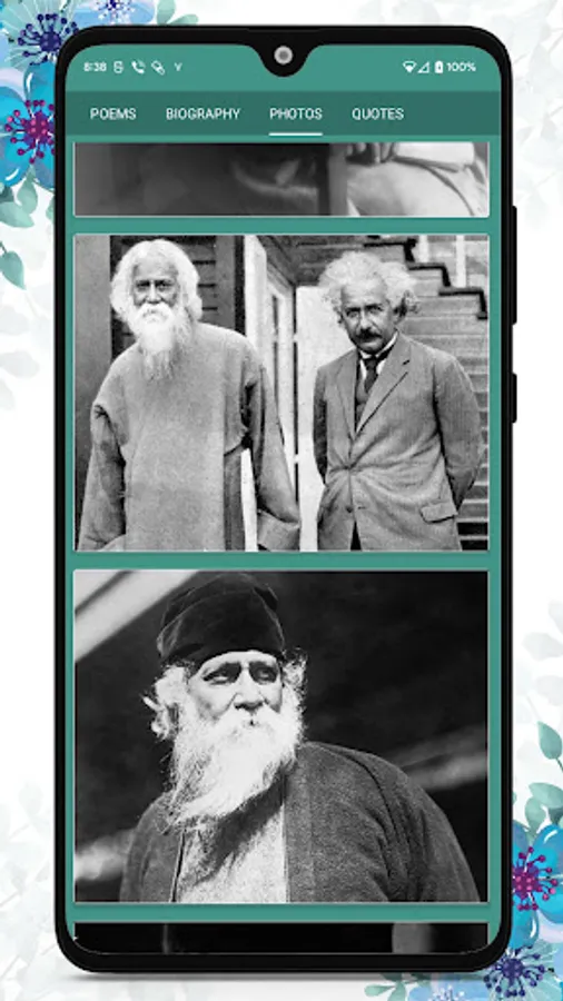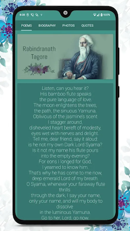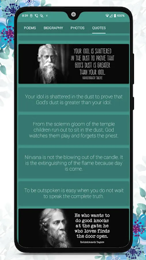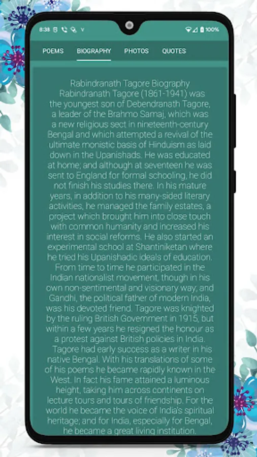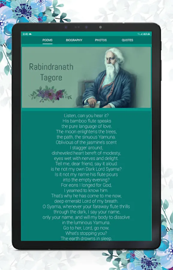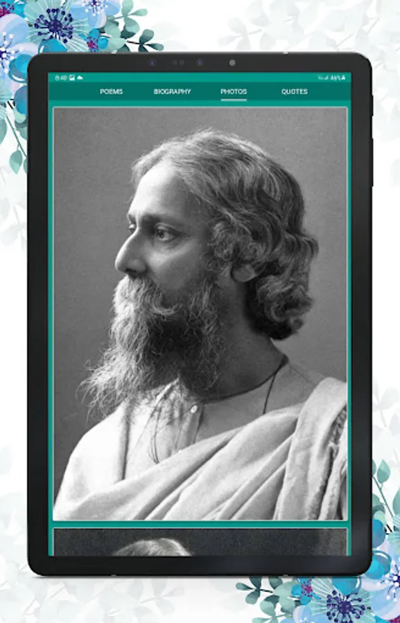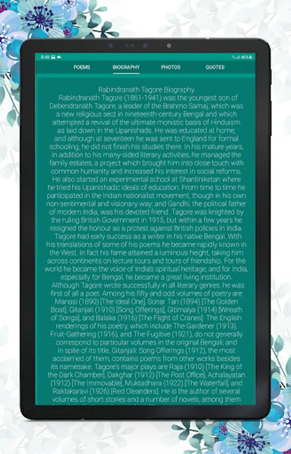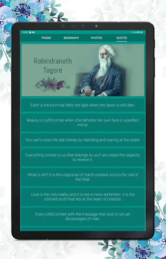 In this little app we have compiled Biography, Quotes, Poems from Gitanjili and Photos of Sir Rabindranath Tagore in a beautiful design.