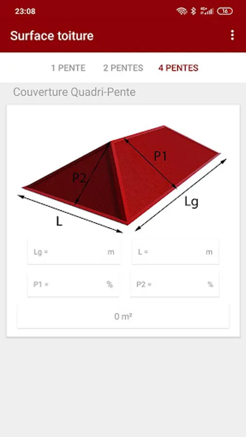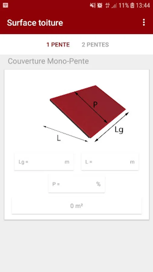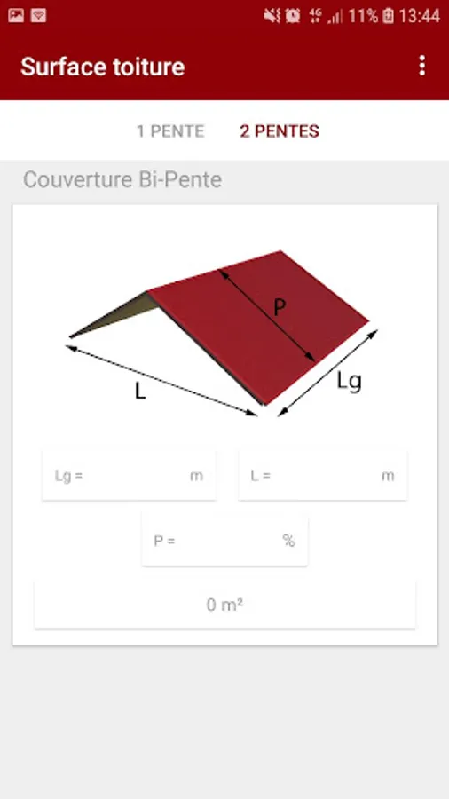 By entering some basic data necessary for the calculation of the surface area of a roof, the application will provide you with the surface area of the roof (whether for roofing (sheet metal, copper, slate, zinc, etc.) or even for insulation under roof), as well as the shelves of finishing accessories (ridge, edges, hip, bottom of slope, gutters).