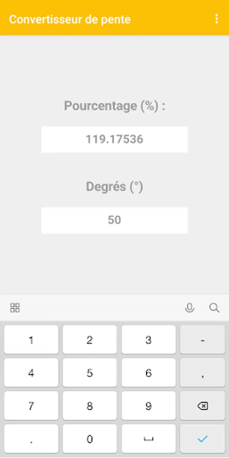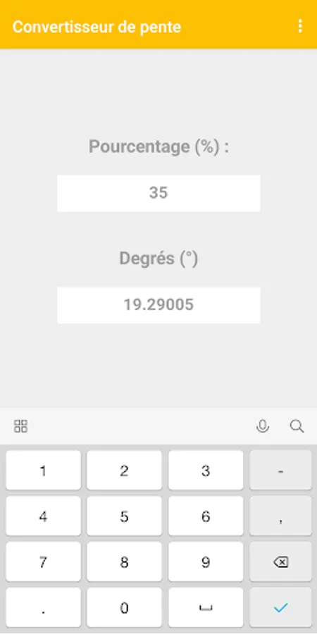 This very easy-to-use application will convert your slopes into a percentage (%), directly into degrees (°), and obviously your degrees (°), into a percentage.