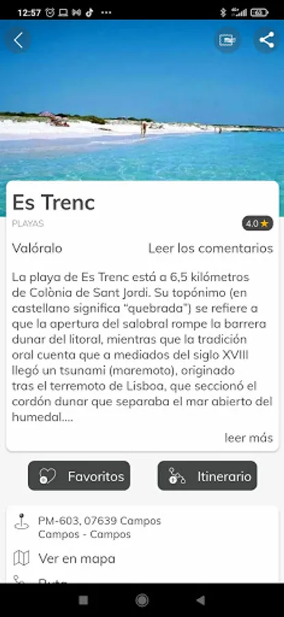 The Mallorca runaway guide includes an extensive directory of monuments, museums, beaches, bars, restaurants, dance clubs, and many more—each record accompanied by full descriptions of the places, images, and even user comments that will help you while determining your itinerary to visit Mallorca. As a user of this Mallorca app, you can rate the points of interest and leave comments so that others can read your reviews.
