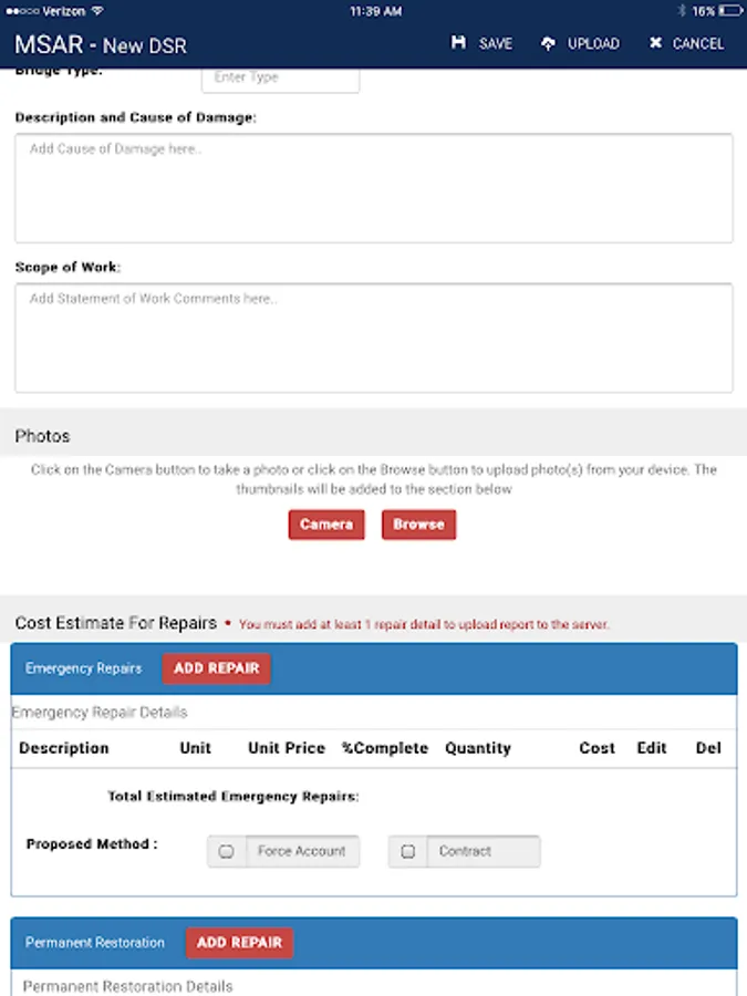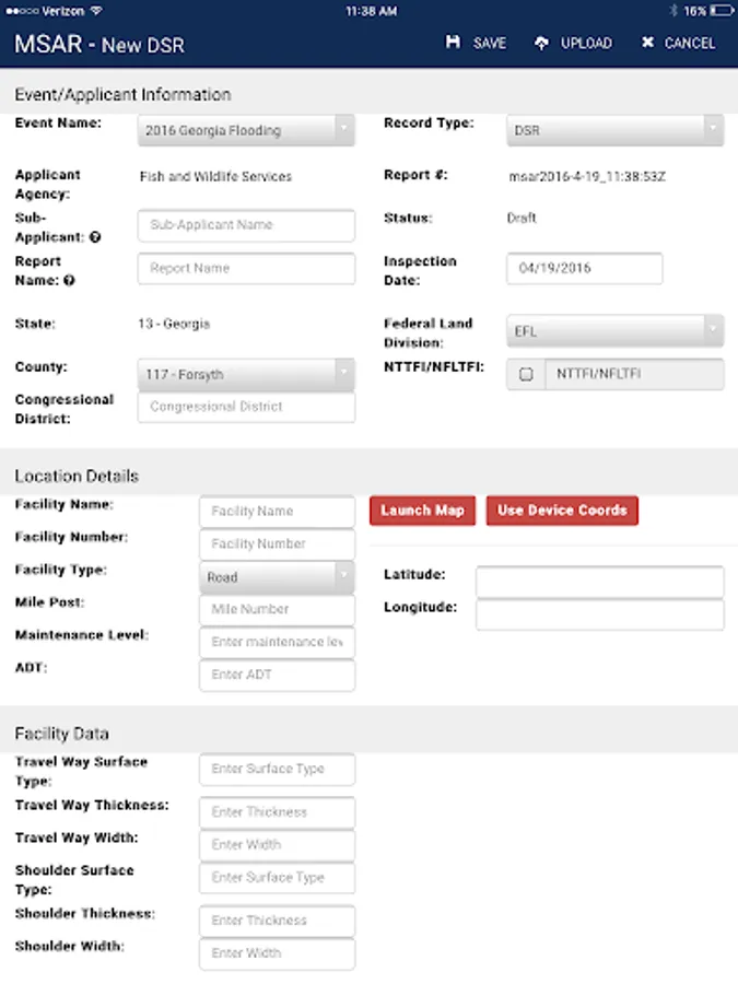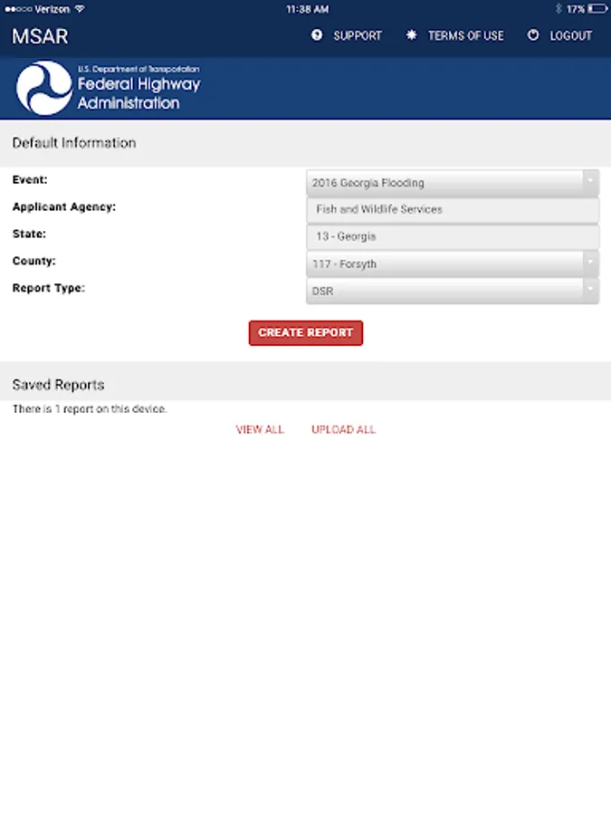 The Mobile Solution for Assessment Reporting (MSAR) application is provided by the Federal Highway Administration. MSAR enables users associated State and Federal Land Management Agencies to submit repair assessments under the Federal Lands ERFO and Federal Aid ER Programs. The application streamlines by submission process by automating data capture (location details, photos, and assessment data) and approvals.