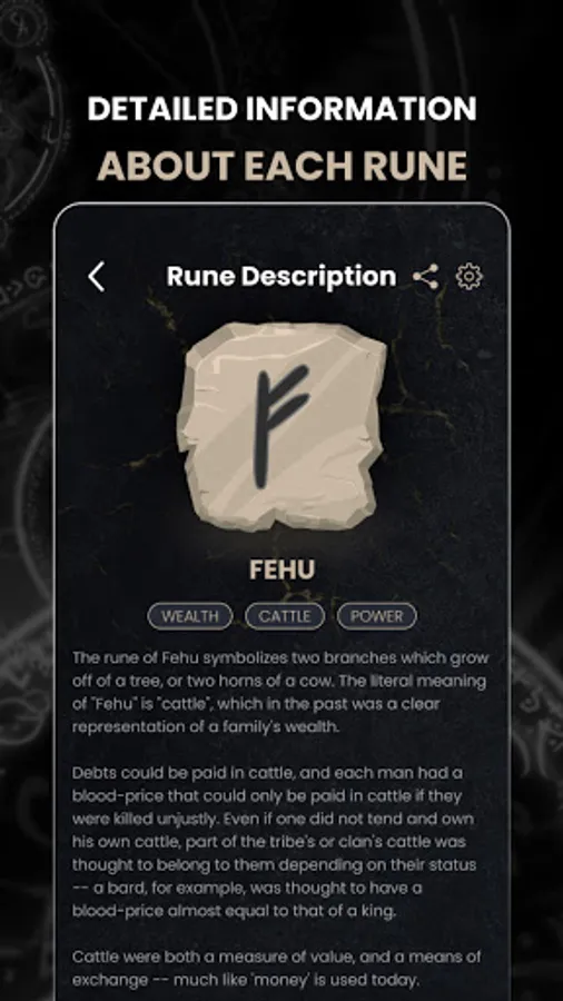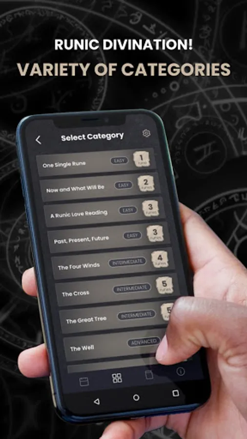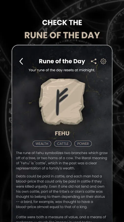 The application uses the traditional number of runes: 24. Check the rune of the day every day. The symbol will get you a divination for today and will help you navigate and make the right decisions during the day. Ask for advice about love, finances, health - open the runes and look for the decoding symbol to answer the question.
