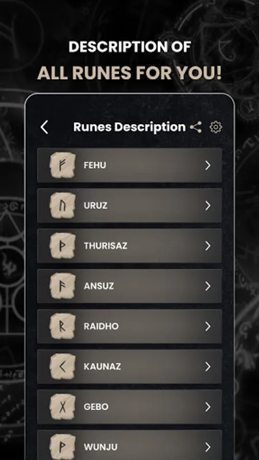 Learn the correct name and meaning of each rune. Learn what each sign means in regular and inverted form. Master the reading of the runes and analyze their detailed interpretation. You will be able to read the runes in the app even if you have never done it before.