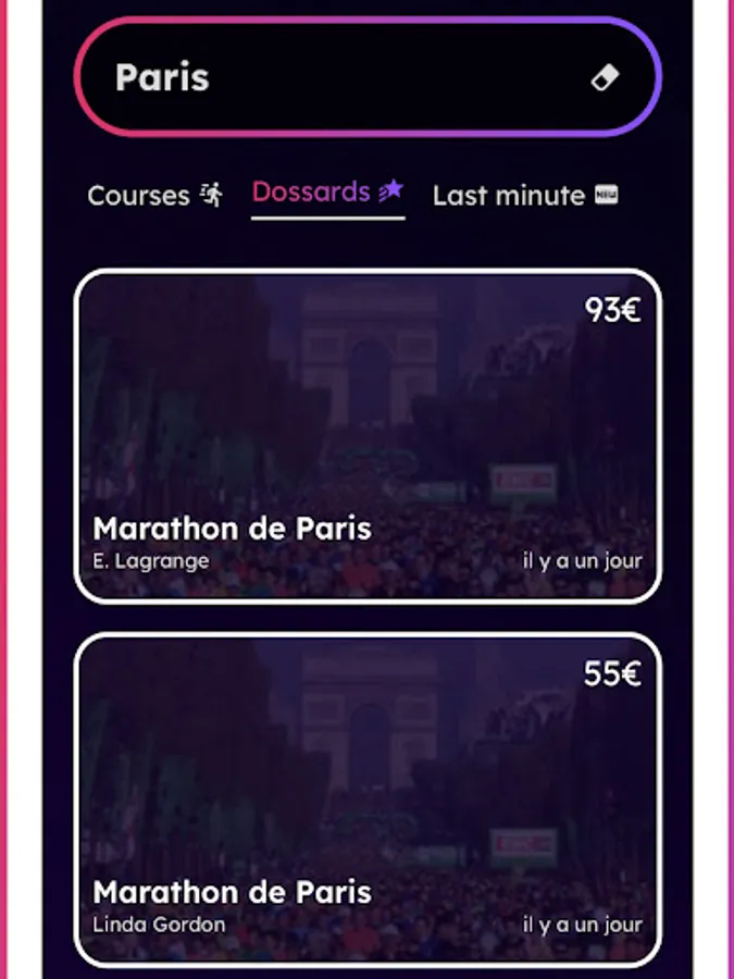 Finding a bib for a sporting event can sometimes be a real challenge. You could find yourself without a bib for a race you want to participate in, or be faced with a last minute impediment that prevents you from starting. This is where Runintwo comes in by offering you a user-friendly platform to buy or resell bibs with ease.
