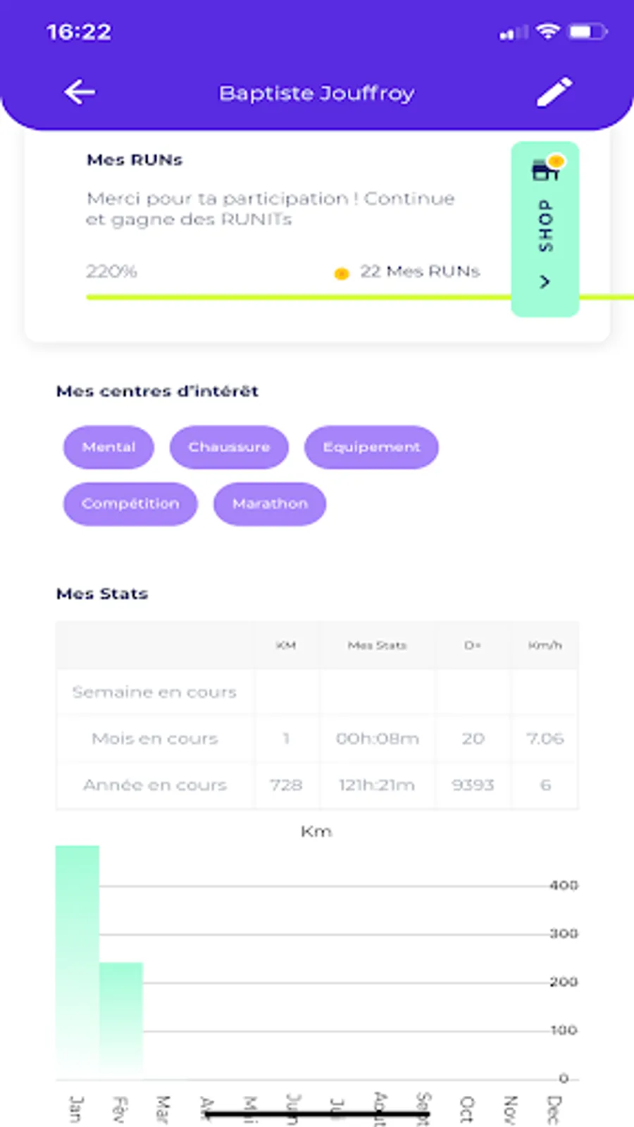 You find your RUNit counter on your profile page. This is also where you find your simple statistics for number of km, D +, speed per week, month and year.
