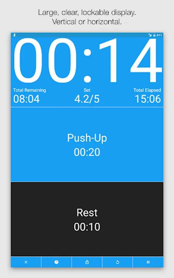 The timing screen has a large, clear, time display that can easily be read from a distance. It works in portrait or landscape. The current interval and next interval are displayed so you can see also what's up now and next. The entire background uses the current interval colour so you don't even need to read the name.