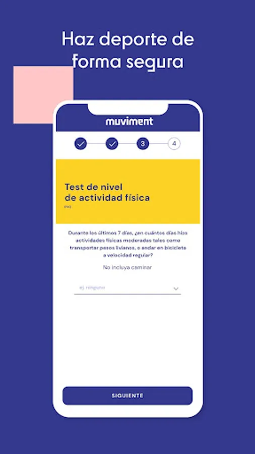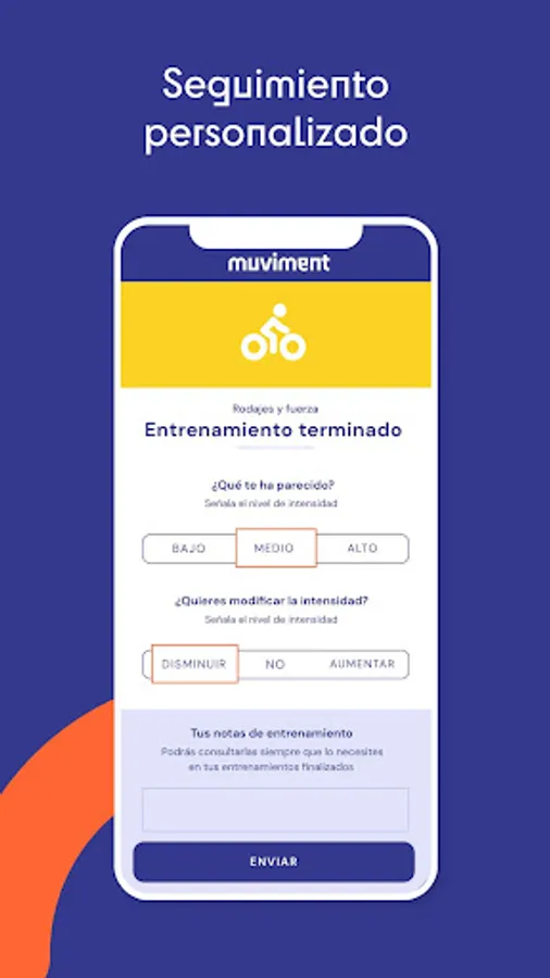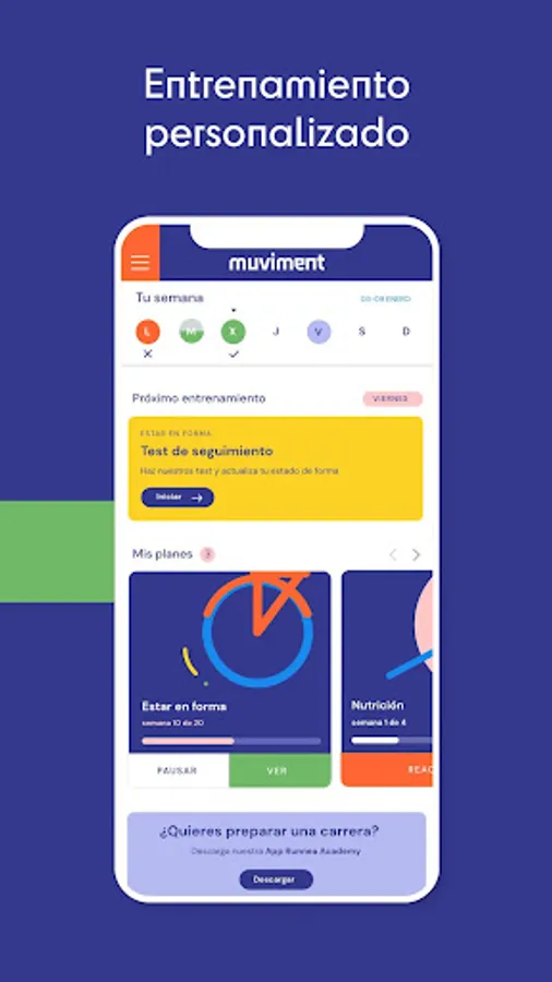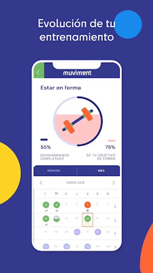 Help improve the physical shape of your citizenship. muviment facilitates the control of the evolution of the state of form of the person. It also makes it possible to monitor the progress made. A personalized plan that includes mobility (walking, cycling or cardio machines), strength (you can do it at home or in a gym), stretching.