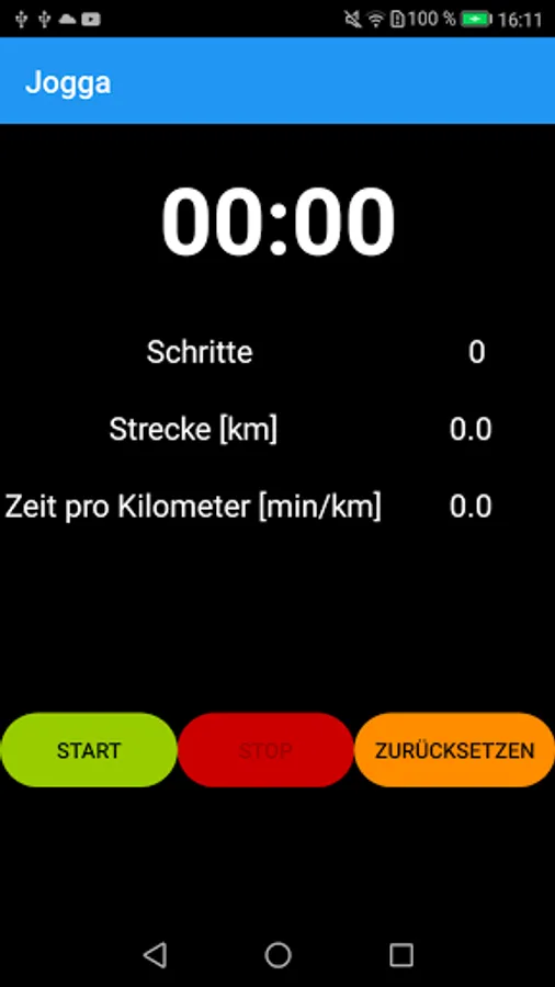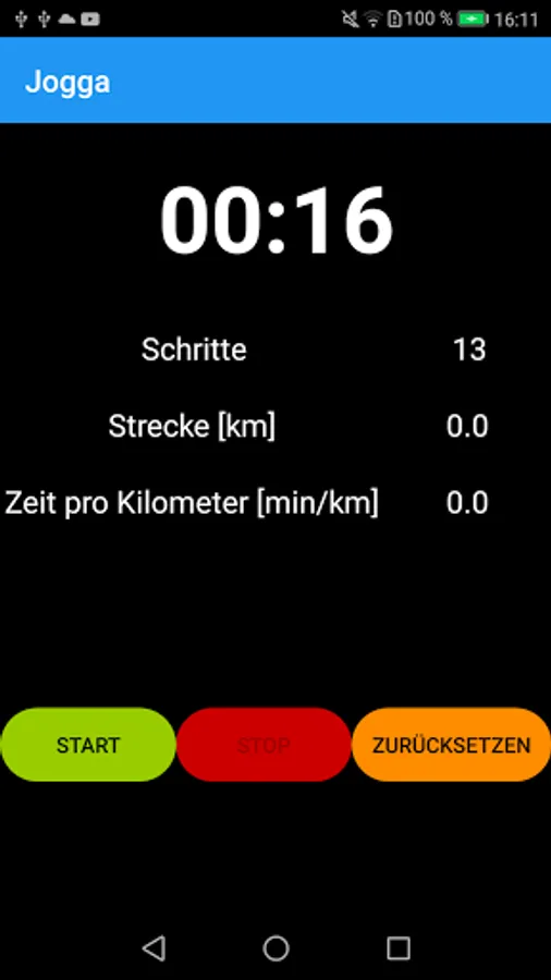 The app is controlled with start / stop and shows the time, the steps, the distance covered (km) and the time per kilometer (min / km).