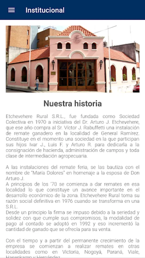 Etchevehere Rural S.R.L., was founded as a Collective Society in 1970 at the initiative of Dr. Arturo J. Etchevehere, who that year buys Mr. Victor J. Rabuffetti a livestock auction facility in the town of General Ramírez. It constitutes at the moment a society in which his children Ivar J., Luis F. and Arturo R. participate to dedicate it to the appropriation of finance, administration of fields and all kinds of agricultural intermediation.