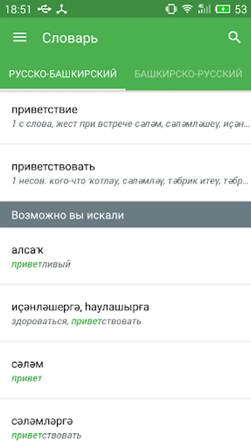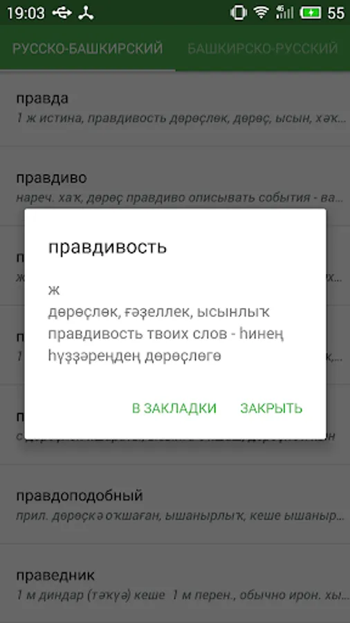 Russian - Bashkir and Bashkir - Russian offline dictionary.