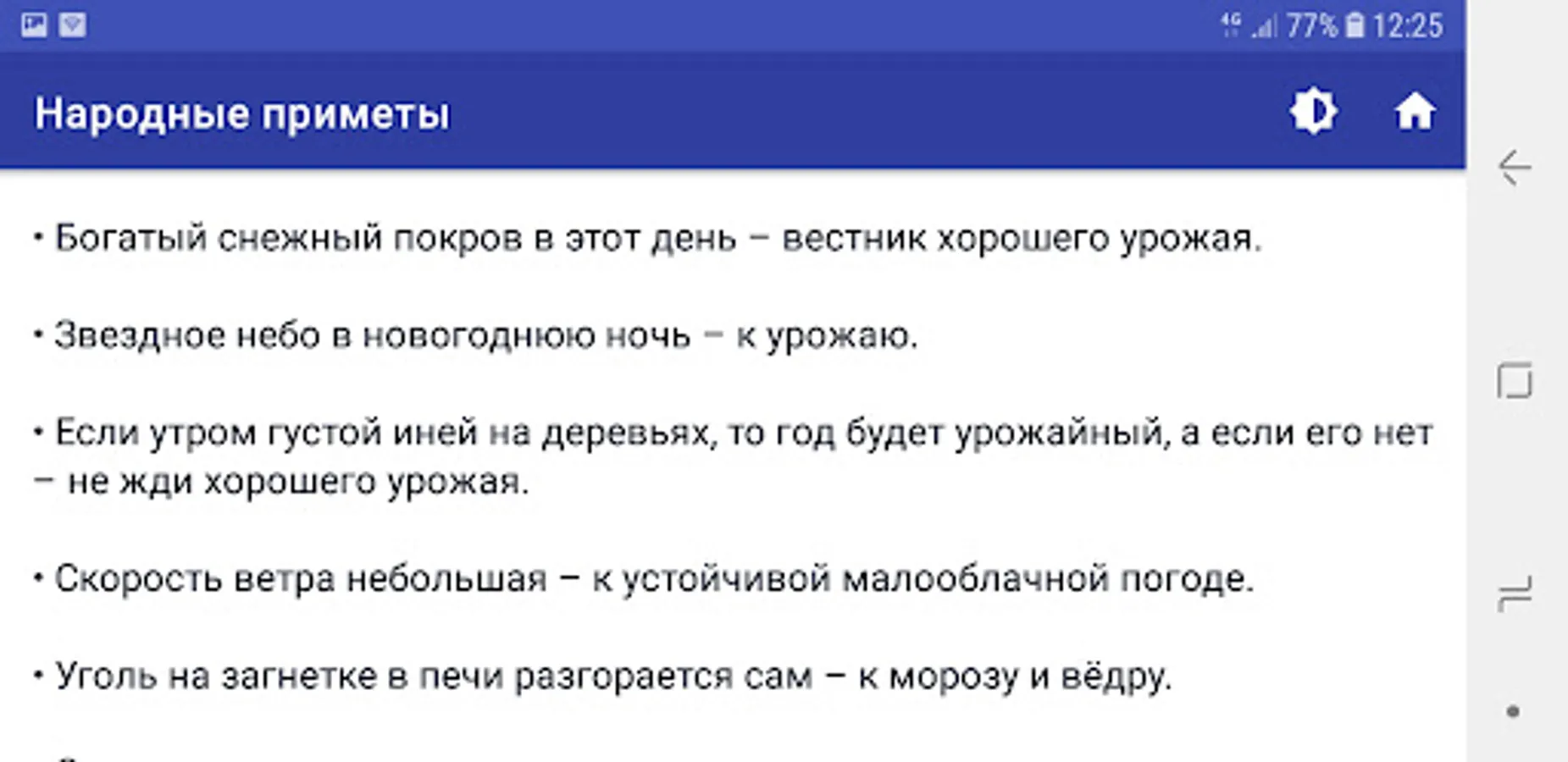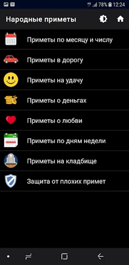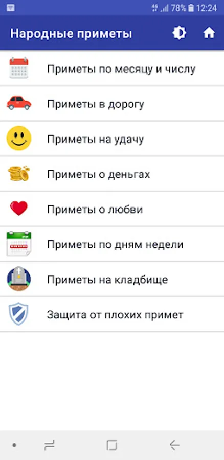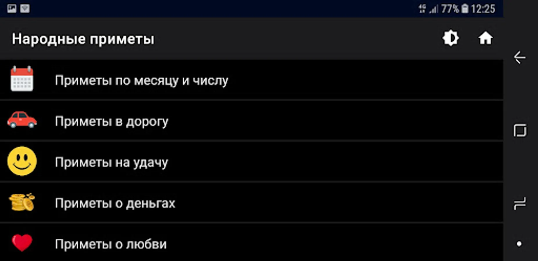 The application contains a large number of folk signs, which are divided into categories. Signs by number and month, signs on the road, signs for good luck, signs about money, signs about love, signs on days of the week (from Monday to Sunday), signs at the cemetery (as well as rules of conduct there) and ways to protect against bad omens.