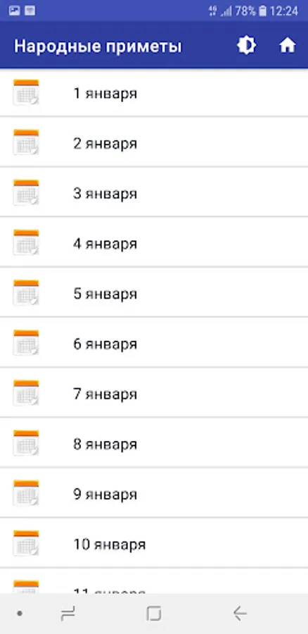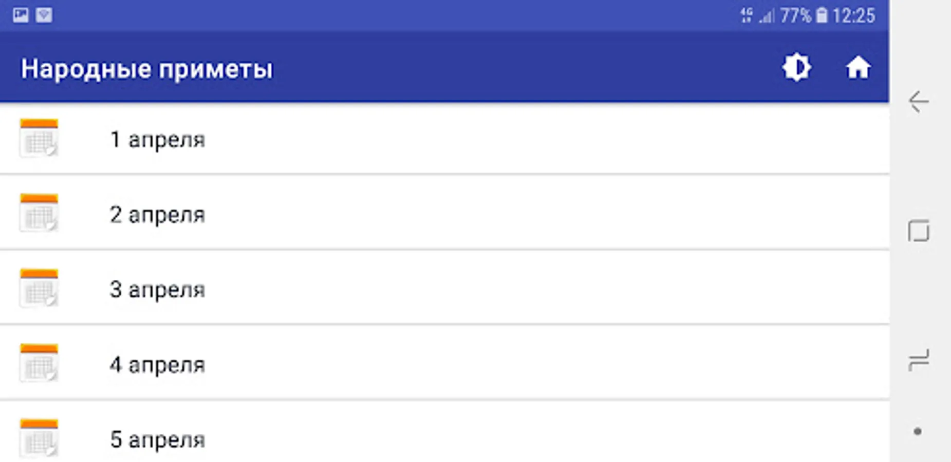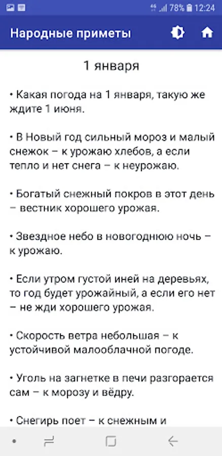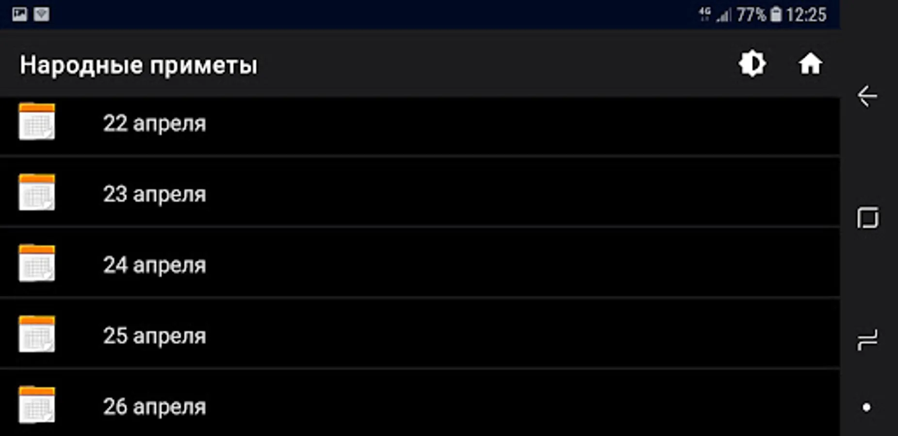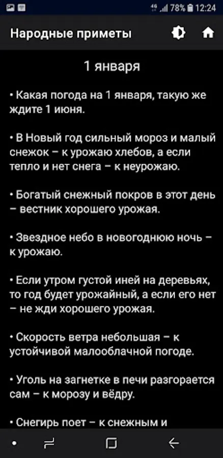 The application contains a large number of folk signs, which are divided into categories. Signs by number and month, signs on the road, signs for good luck, signs about money, signs about love, signs on days of the week (from Monday to Sunday), signs at the cemetery (as well as rules of conduct there) and ways to protect against bad omens.