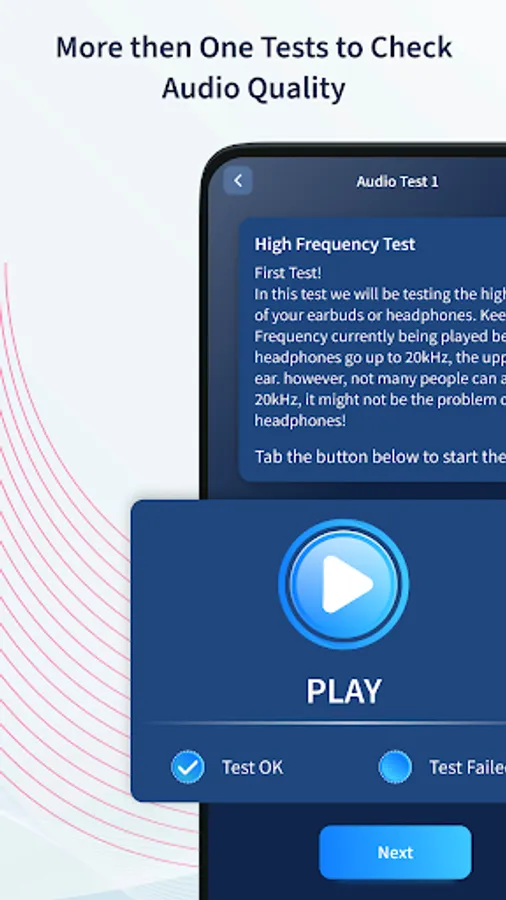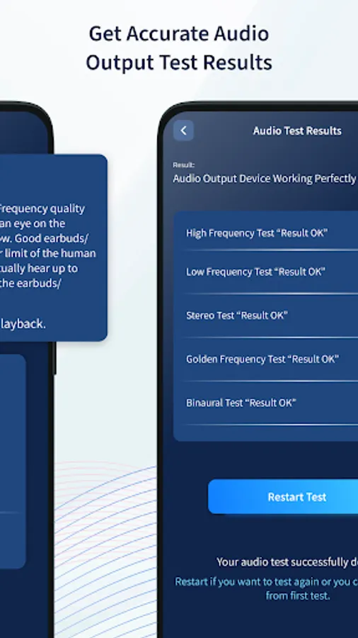 With this app, you can test the audio quality for earbuds and headphones. In this, you can test the high Frequency, low Frequency, Stereo, Golden Frequency, and Binaural for your earbuds and headphones. After all the tests are complete you get the result that the audio output device is working perfectly or not. If you want to retest you can test again or you can restart the test from the first test.