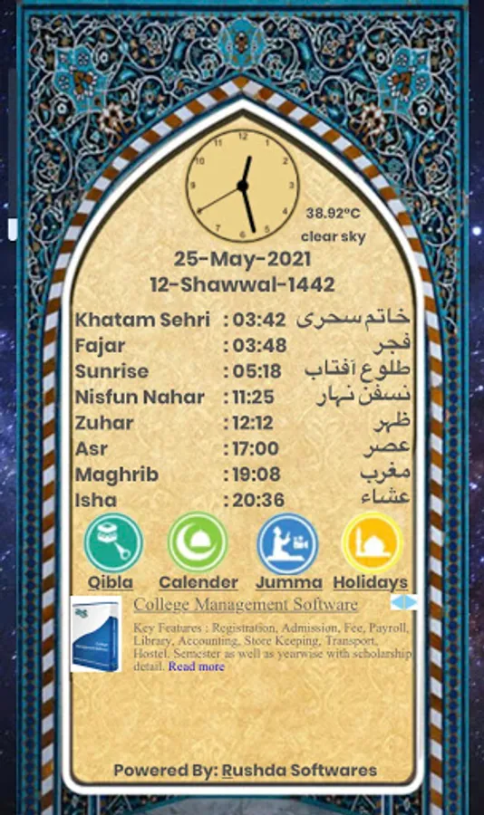 Namaz Time app is designed only for people of Moradabad, Uttar Pradesh India. This is a free app designed only for information purpose to the people of Moradabad to find the prayer timings, qibla direction, islamic calender and important dates.