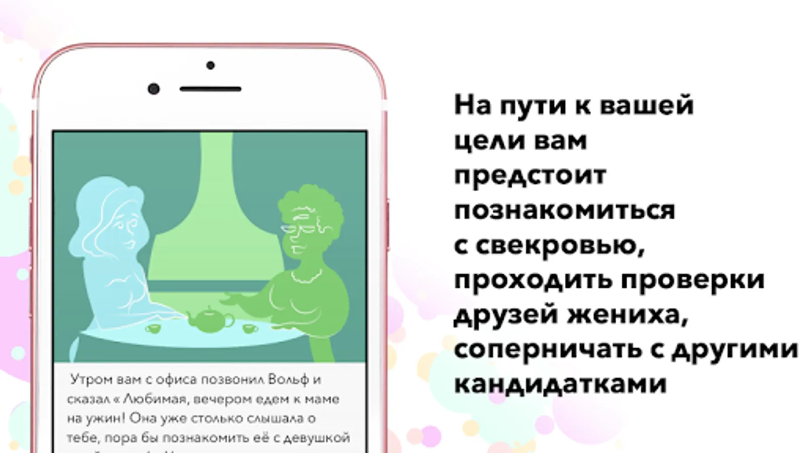 During your journey, you need to fool your chosen one, go on dates with him, meet the mother-in-law, go through the checks of the groom's friends, compete with other candidates!