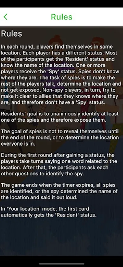The game is played in conversation mode. One of the players secretly becomes a spy and his task is to find out where he is. Other players know the location, but don't know who the spy is - that's up to them to figure out. How? By asking each other questions, of course! Dancing around the bush in this way, the players feel for the ground, try to understand which of the players is the spy and begin to suspect the players. Here the spy will need to improvise, what if someone asks him a question? Or will he decide to ask questions to divert suspicion from himself? The spy must, during all conversations, understand where he is and make a statement about this before they figure him out!