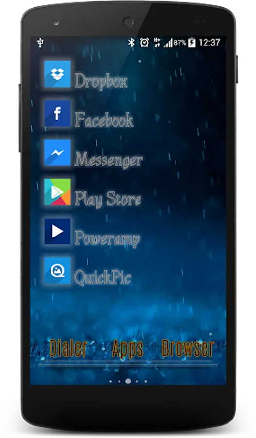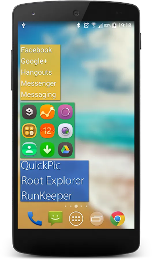 Organize and easily start apps, shortcuts, device settings, make calls and open browser bookmarks. Launchy can replace folders, contacts widgets and bookmarks widgets. Organize your desktop, make it look great and much more intuitive to use, apply skins and third party icon packs for unique looks.