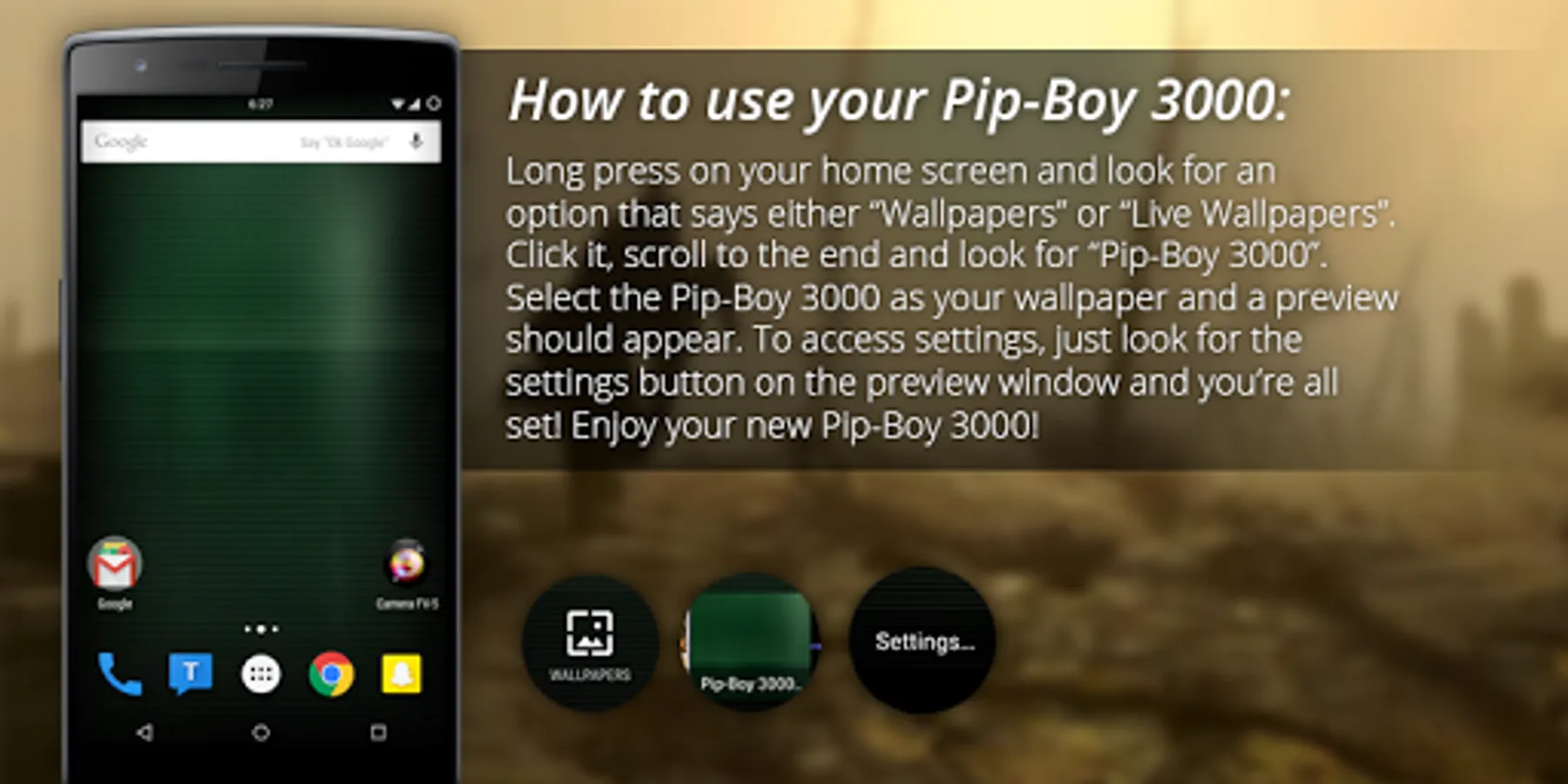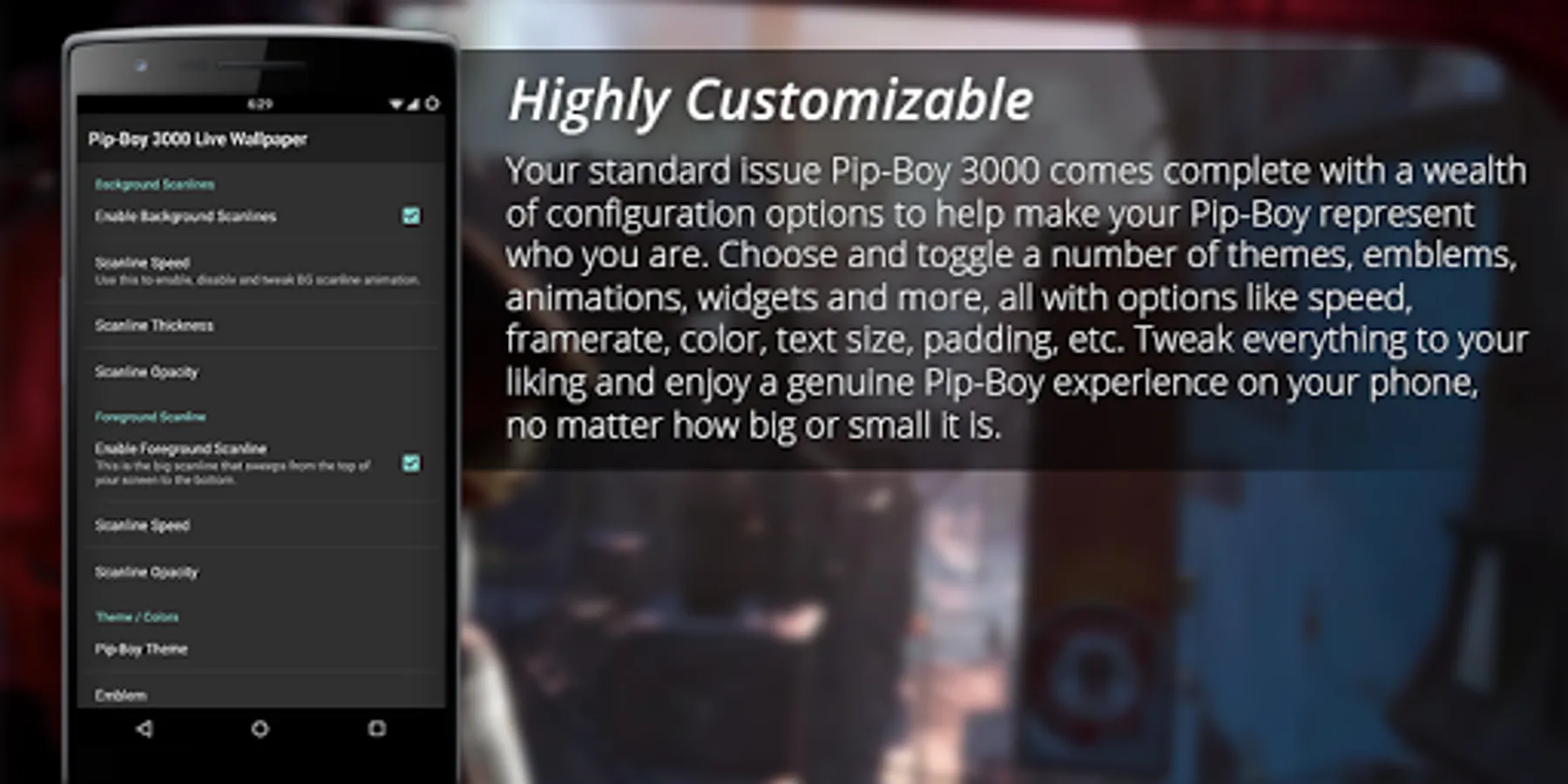 Transform your device into a Pip-Boy 3000 from Fallout 3 and New Vegas, with this fully animated and customizable live wallpaper!