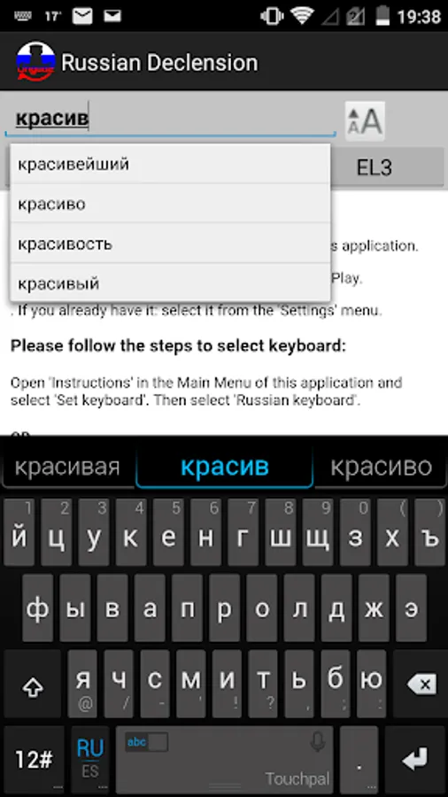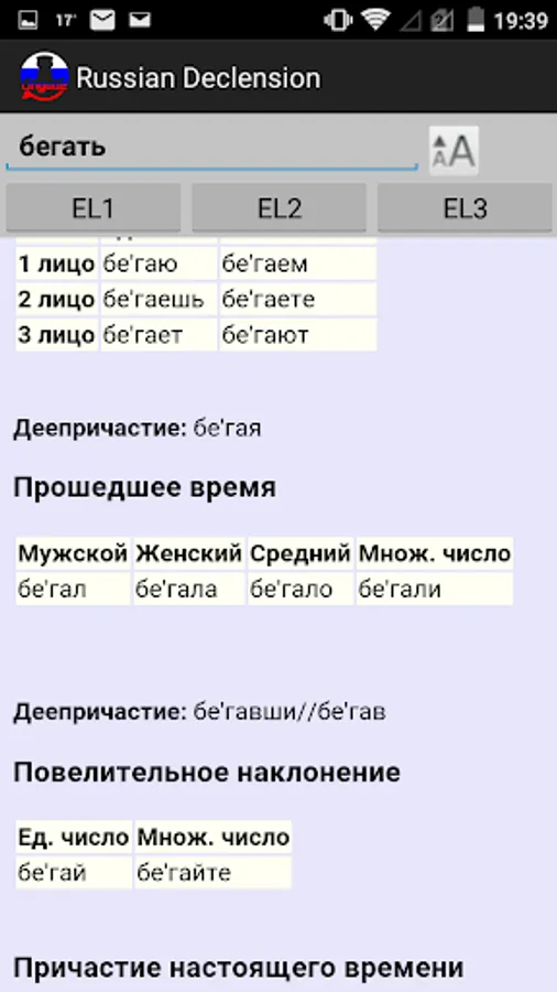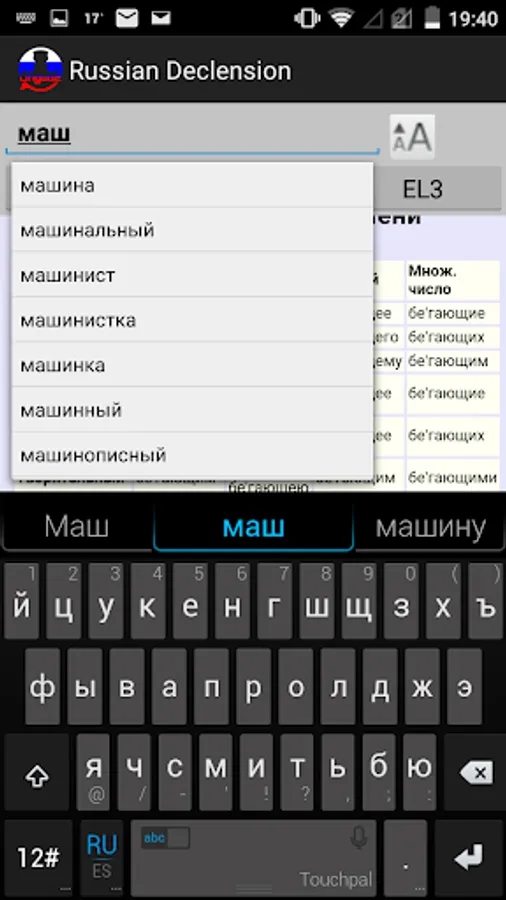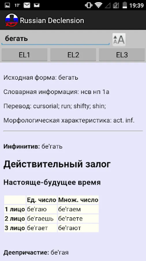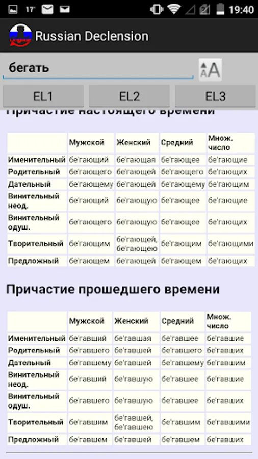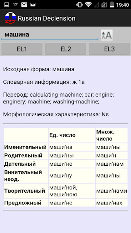 Declension and conjugation of more than 20,000 Russian words from the Russian dictionary offline with translation. Nominative, accusative, genitive, dative, instrumental and prepositional cases are shown for nouns, as well as verbs in all tenses. Also adjective, adverbs, prepositions, etc.