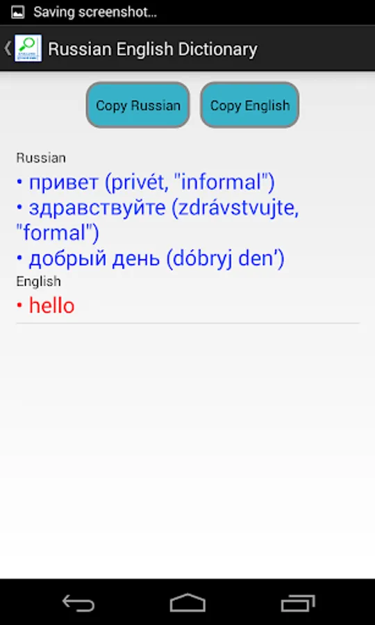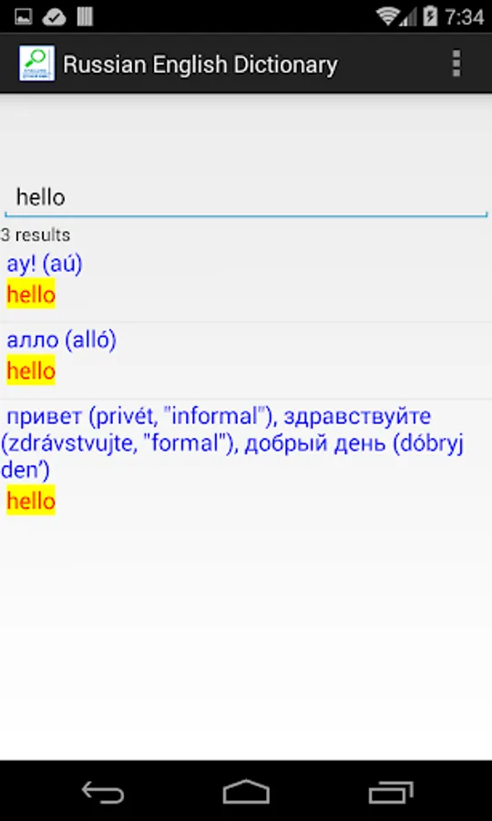 This English Russian dictionary is perfect when you are traveling to other countries. You don't need an internet connection for this Russian English dictionary to work. This English Russian dictionary works offline so you don't need a data connection.