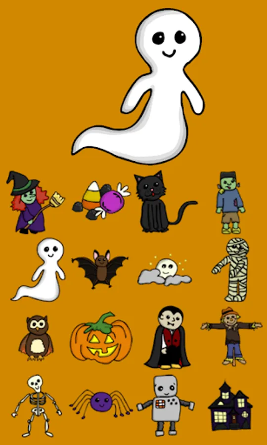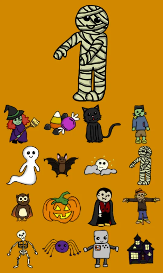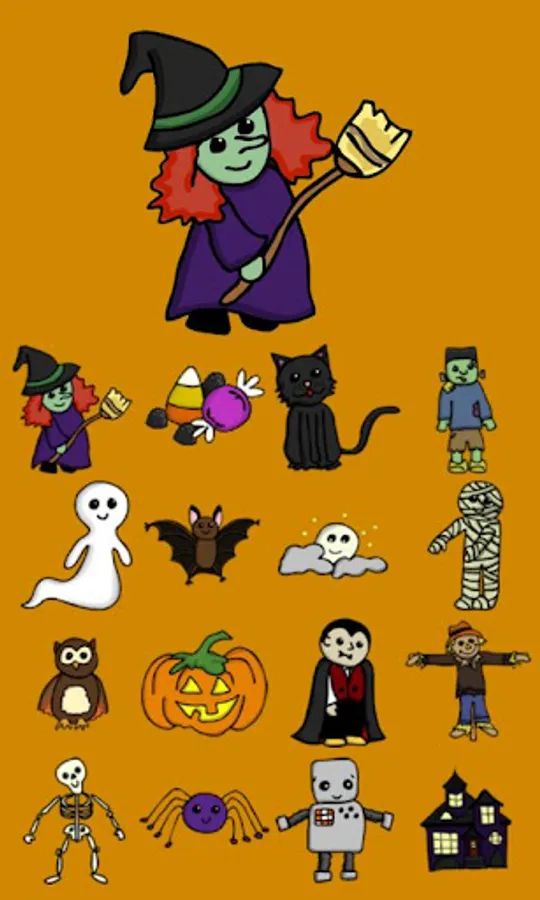 Your kids will become more familiar with lots of Halloween characters, including: witch, candy, cat, Frankenstein, ghost, bat, full moon, mummy, owl, pumpkin, vampire, scarecrow, skeleton, spider, robot, and haunted house!