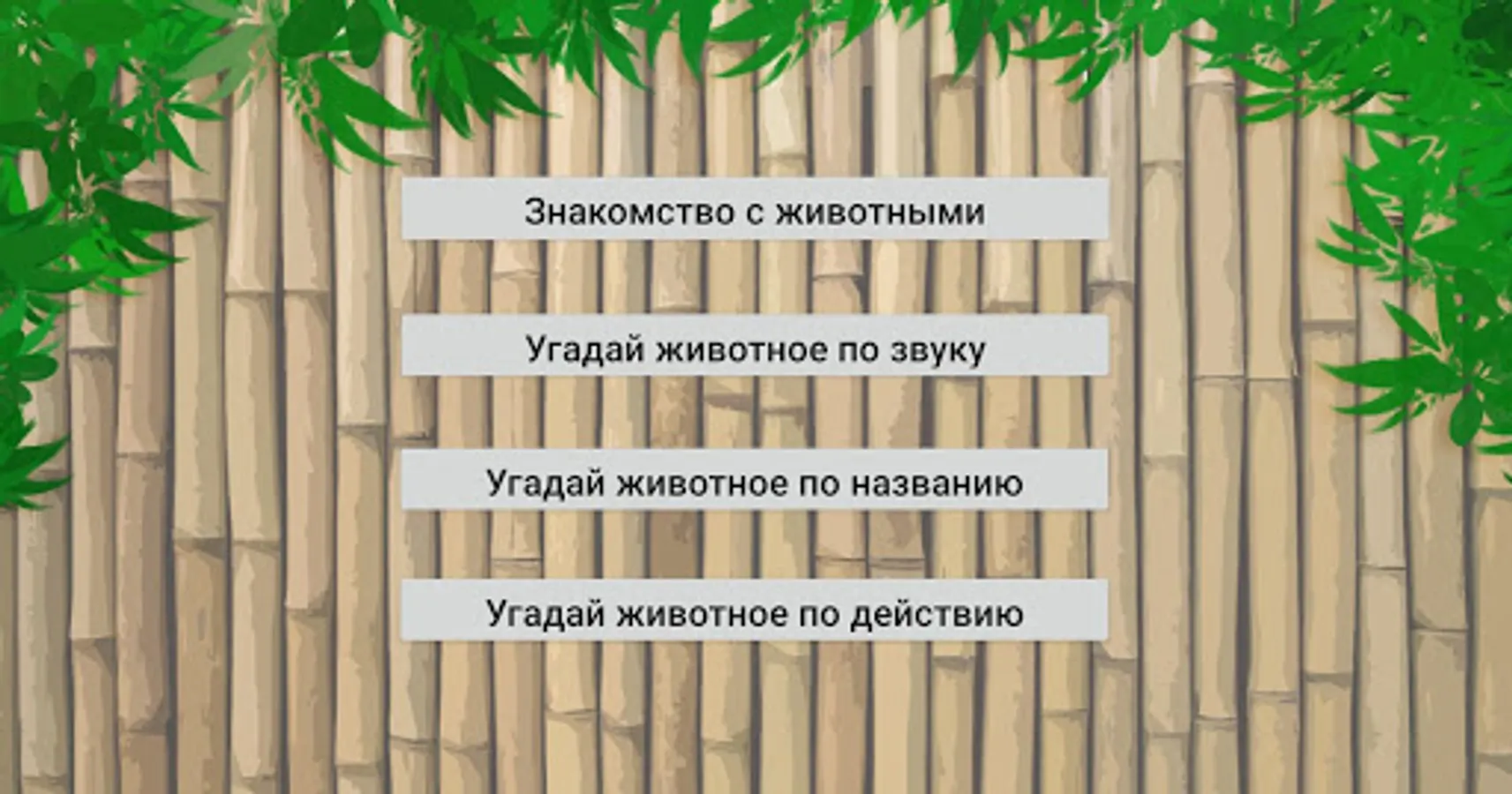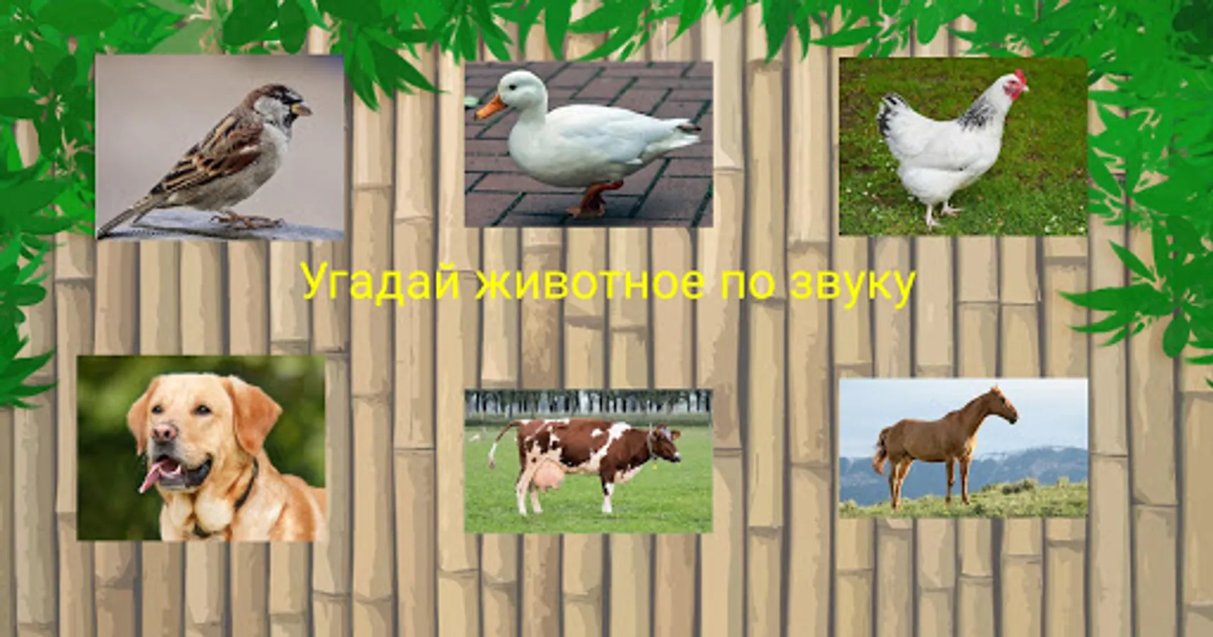 The kid will be able to learn the voices of animals and their names. After that, there are three quizzes “Guess the animal by sound”, “Guess the animal by name”, “Guess the animal by action”. Sounds of victory or failure are heard depending on the result.