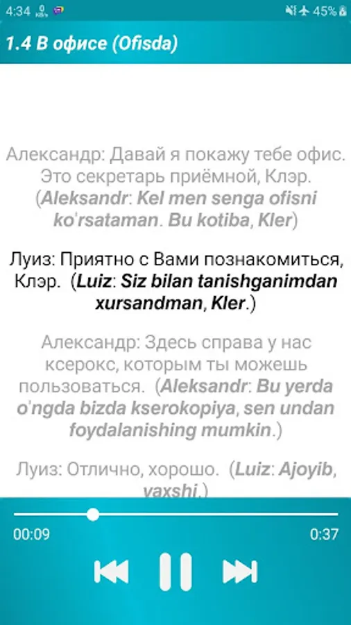 Ruscha so'zlashgich Ilovada 50 ga yaqin kundalik islatiladigan, insonlar suhbatida ishlatiladigan dialoglar audio mp3 talqinda va matni tarjimasi bilan.