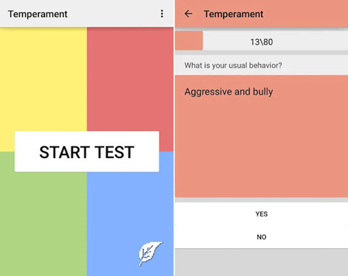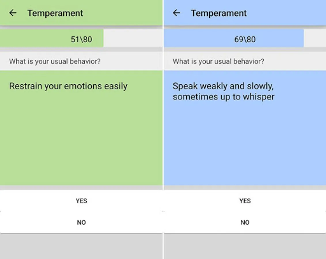 Temperament test - this app psychological test. In order to find out what type your temperament is, you have to answer 80 questions by choosing one of two options: YES or NO.