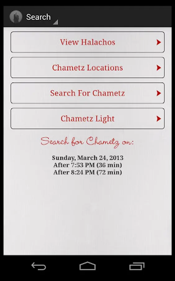 The app helps you search for Chametz, the bedikat chametz, by giving you the halakhah, brachas zmanim, a checklist builder and a flash light. It also helps you destroy the chametz with the Bittul and Bi'ur with halakhah, brachas and zmanim for that process. Finally, it helps you sell, Mechirah, the chametz with zmnaim, halacha and a link to sell it to an organization.