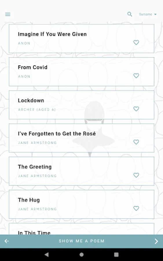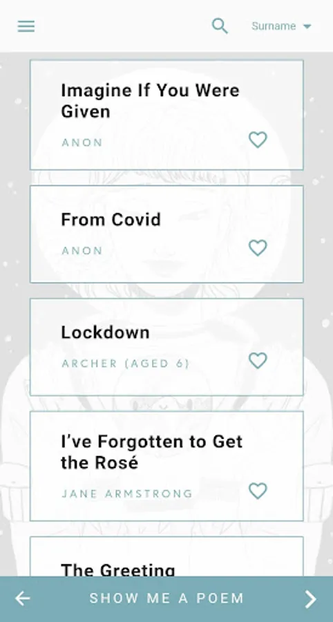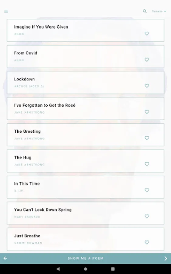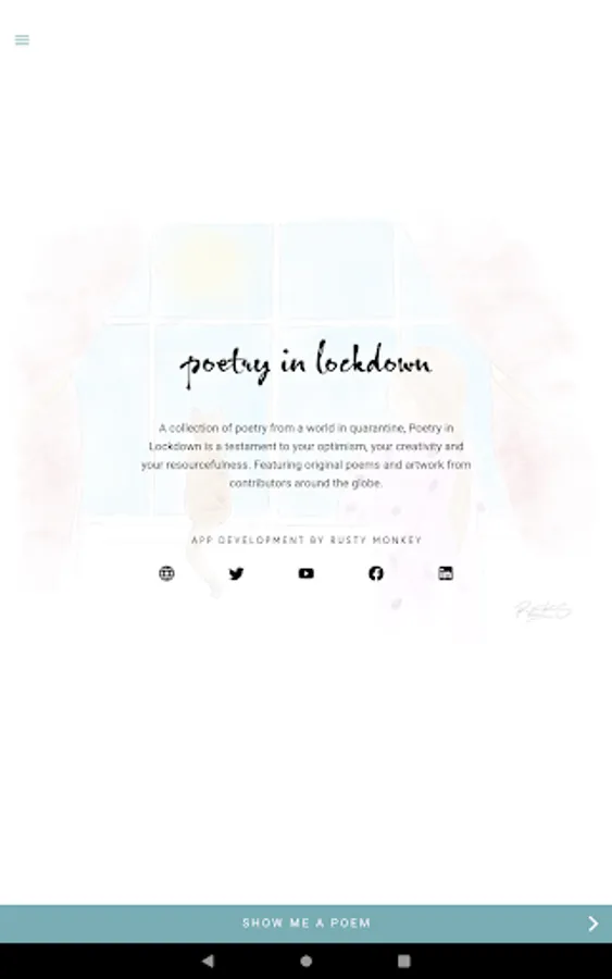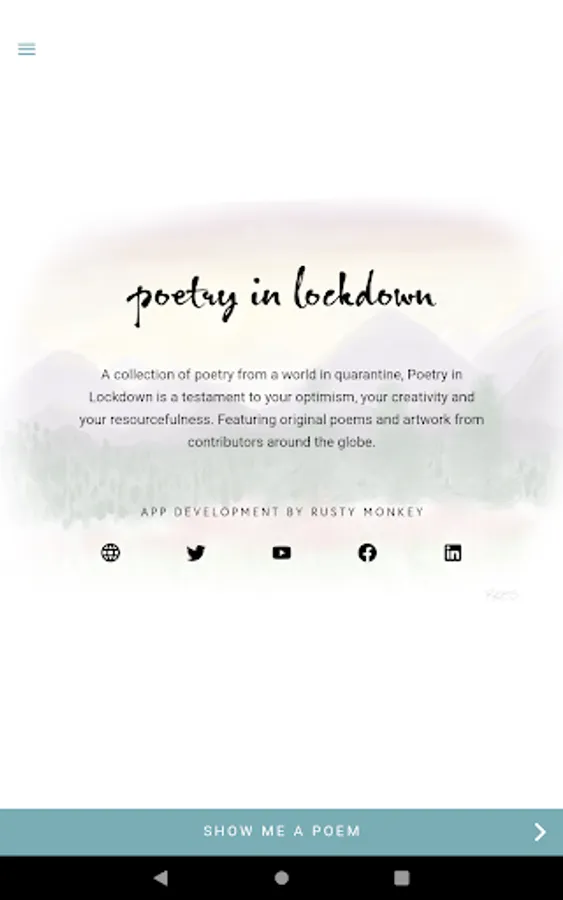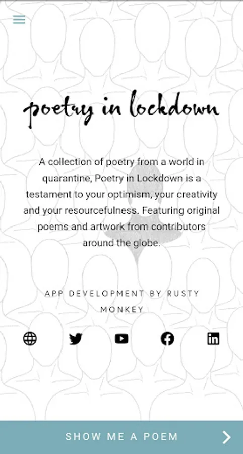 Poetry in Lockdown is a collection of original, previously unpublished works by people from all walks of life. The poetry in this app was submitted as part of a competition run by Nottingham-based creative agency Rusty Monkey during April and May of the 2020 global lockdown. It features a range of different experiences and interpretations of the era-defining events of this spring. These poems are testaments to creativity, positivity, love, humour and friendship, and we have collected them in this app so that they can be enjoyed by all and remembered forever.