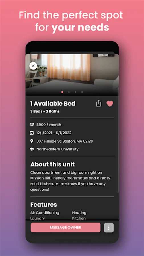 - Create listings for free with up to 10 images, descriptions, and pre-defined questions about price, available beds, preferences, dates of availability, etc.