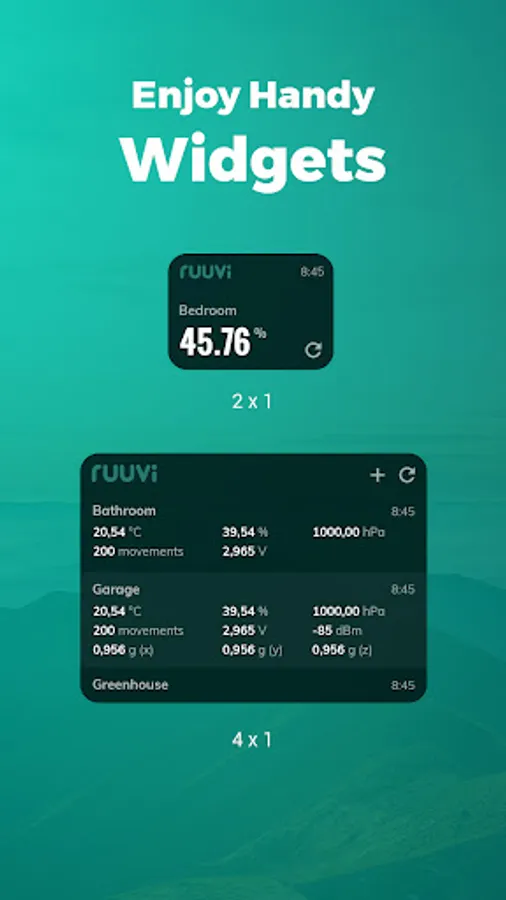 Use our customisable Ruuvi mobile widgets alongside the Ruuvi Station app when data is fetched from Ruuvi Cloud to view selected sensor data at a glance.