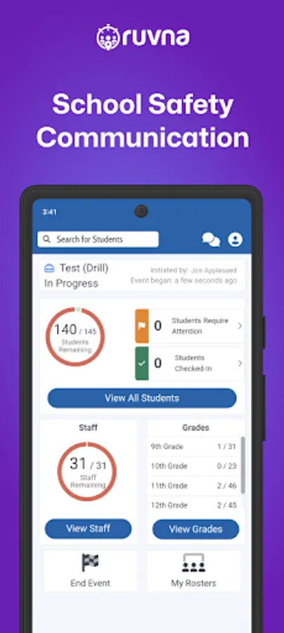 Ruvna moves paper tracking of students during emergencies and drills online. With Ruvna, schools waste no time ensuring the safety of their students and know exactly who needs attention during the emergency, not afterward.